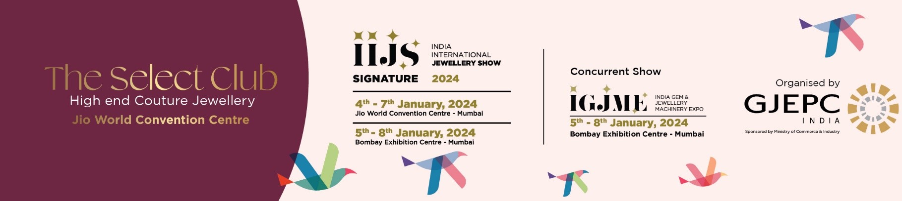 | In continuation to the space application circular dated 29th September 2023,for IGJME 2024 (India Gem & Jewellery Machinery Expo) scheduled from 5th - 8th  January 2024 at Bombay Exhibition Centre, Mumbai, concurrent with IIJS Signature 2024, We are happy to inform you that the booth allotment schedule for IGJME 2024 is scheduled on 1st December 2023 Friday. The centralised location for booth allotment for all applicants (pan India) will be held at GJEPC Mumbai Head Office, D Tower, Bharat Diamond Bourse, BKC, Mumbai 400051. However, for any personal reason, if a member who is unable to make it to the Booth allotment in Mumbai, then member/s can contact the respective Regional Office of the Council. |