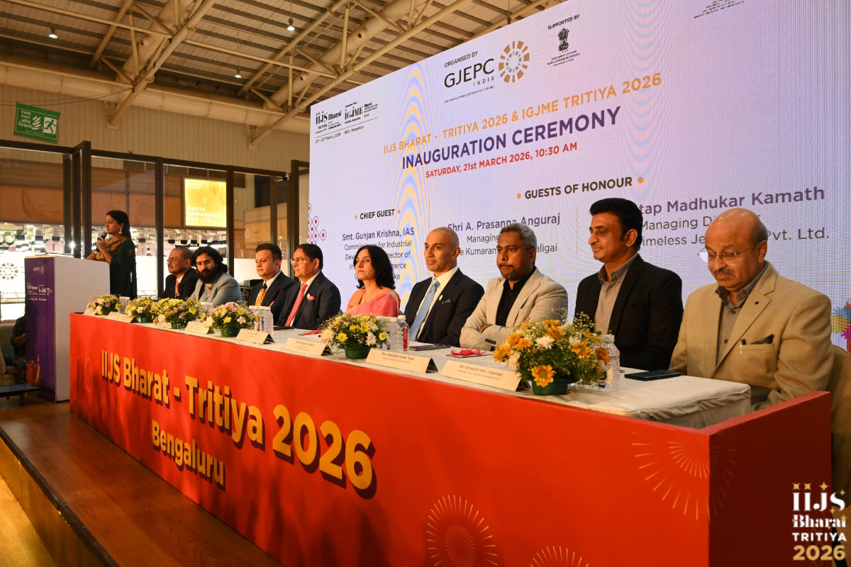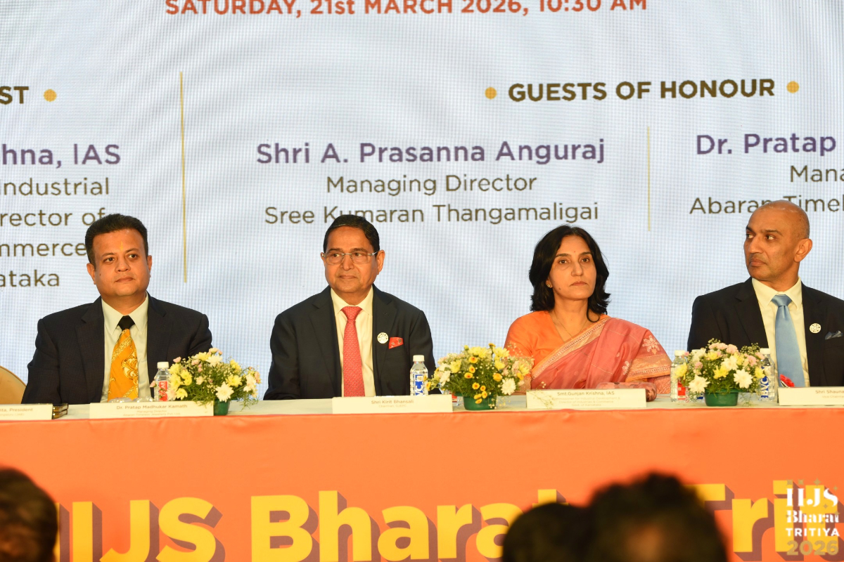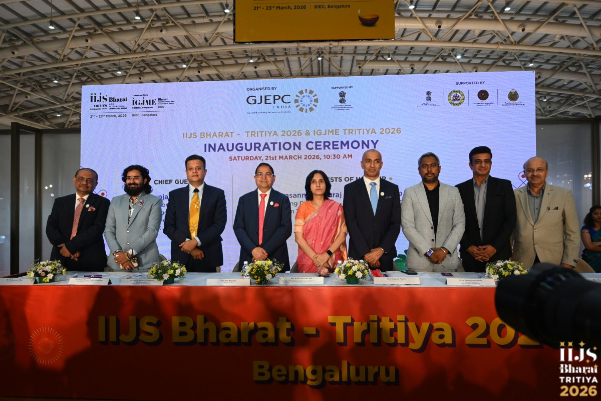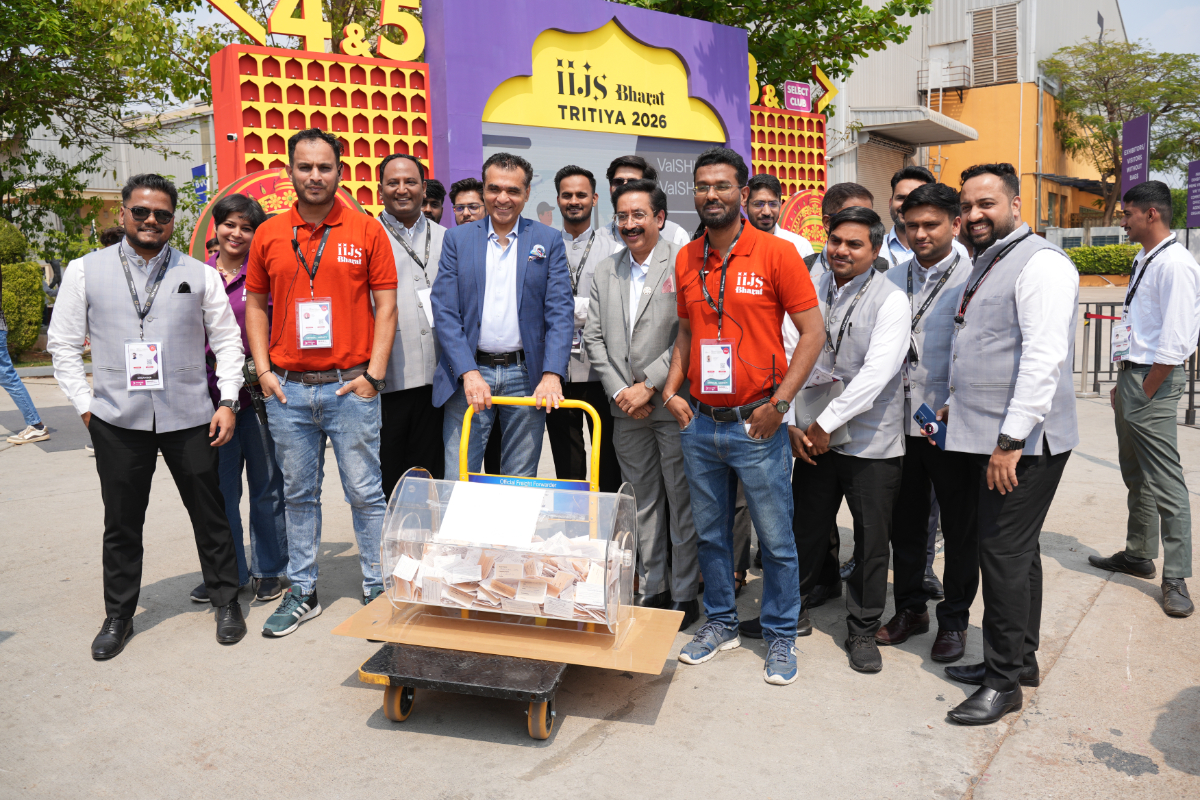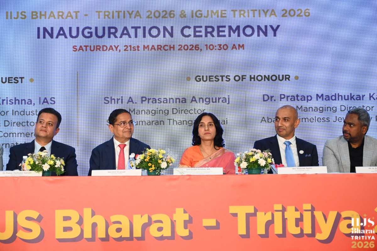 Mr. Sabhyasachi Ray - Executive Director, GJEPC, Mr. Nirav Bhansali - Convener, National Exhibitions - GJEPC, Dr. B. Govindan - Chairman, Bhima Jewellery, ... Dr. Selvakumar, IAS - Principal Secretary to Government, Commerce & Industries Department, Government of Karnataka, Mr. Vipul Shah - Chairman, GJEPC, Mr. Vinod Hayagriv - MD & Director, C. Krishniah Chetty Group, Mr. Kirit Bhansali - Vice Chairman, GJEPC, Dr. Chetan Kumar Mehta - National Vice President, IBJA and President, The Jeweller's Association Bangalore unveiling the Visitor Guide of IIJS Tritiya 2024 Read More