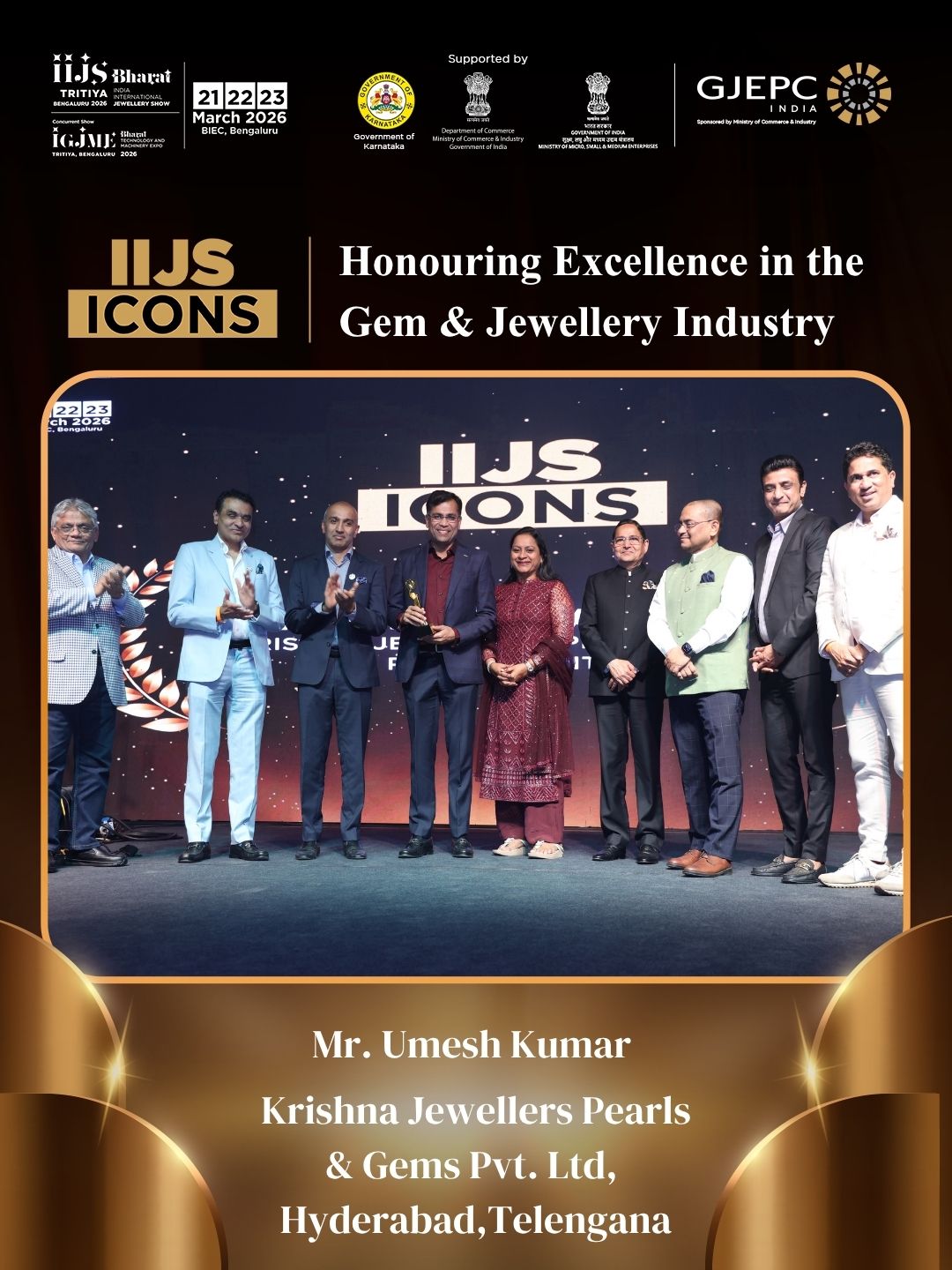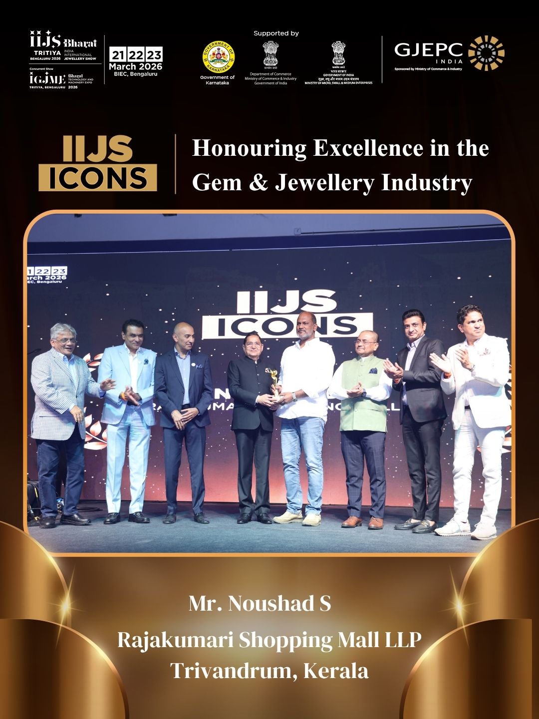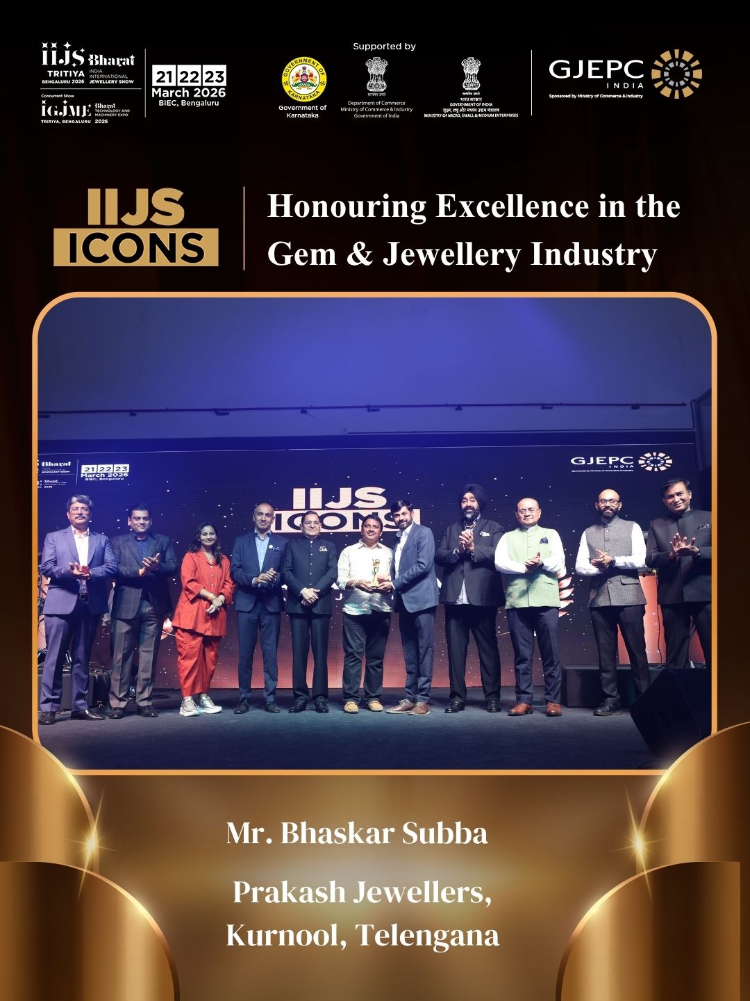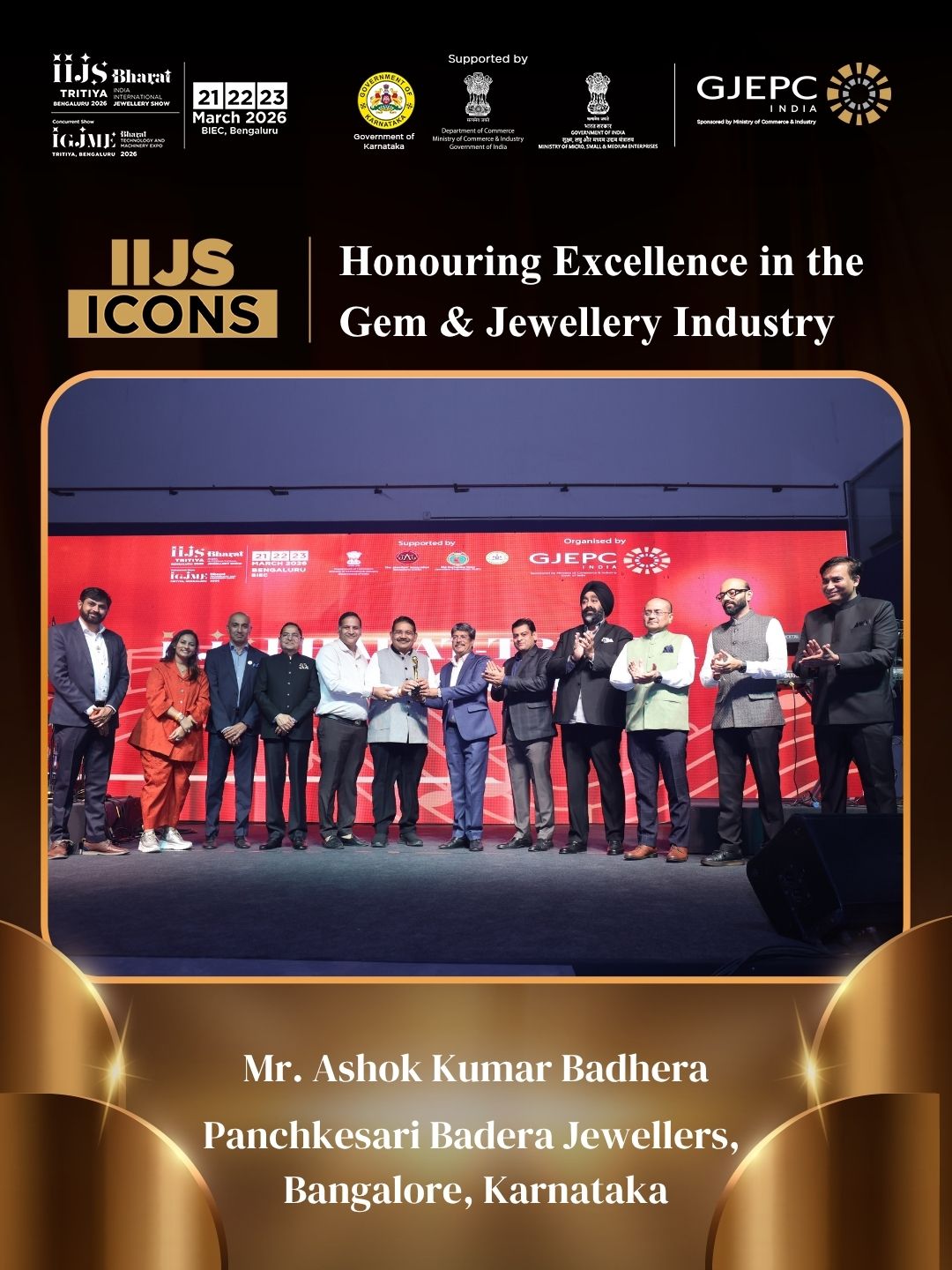 All the dignatories felicitating the IIJS Icon Mr. Shrikant Kari - President, The Karnataka State Jewellers Federation