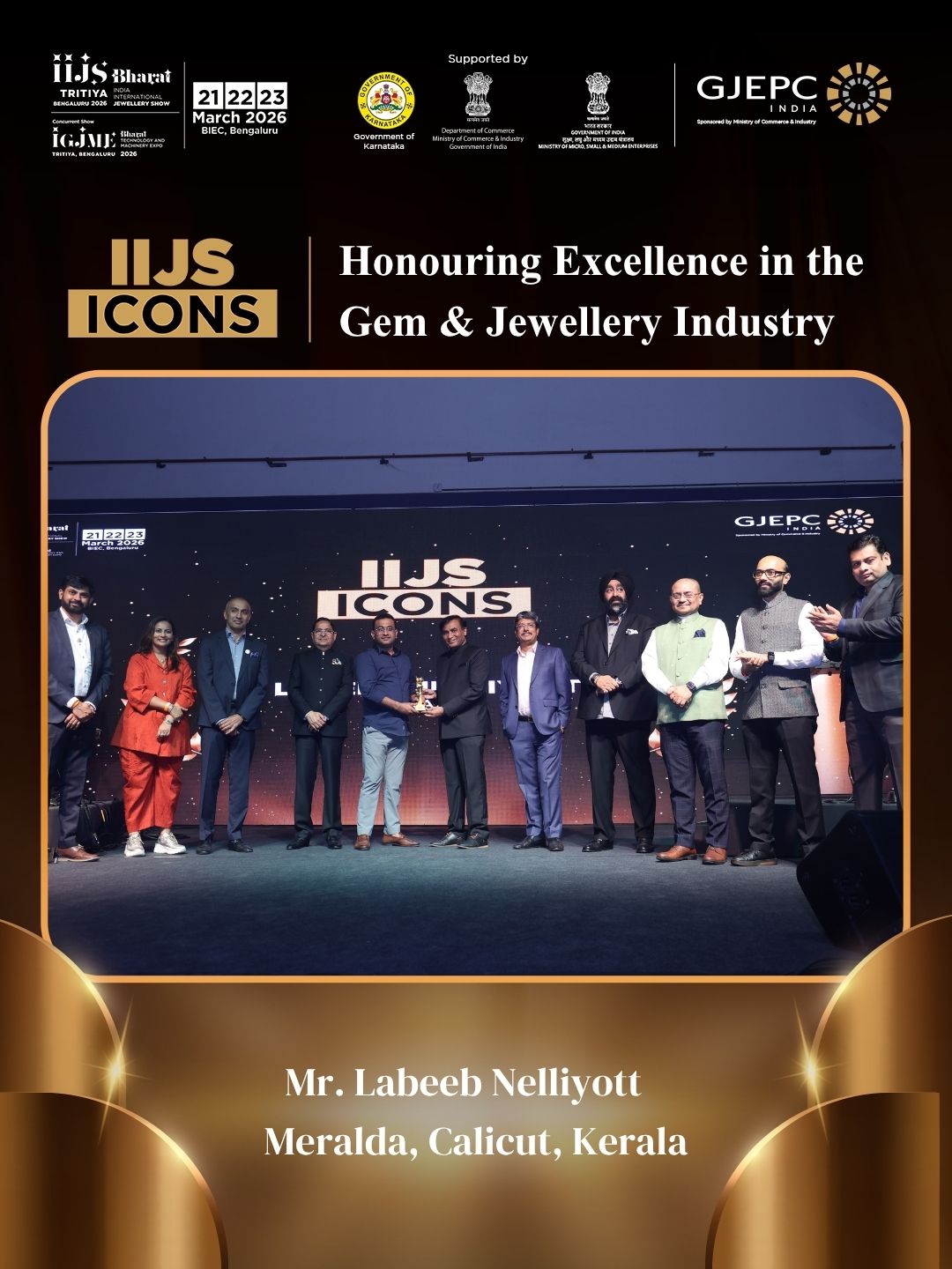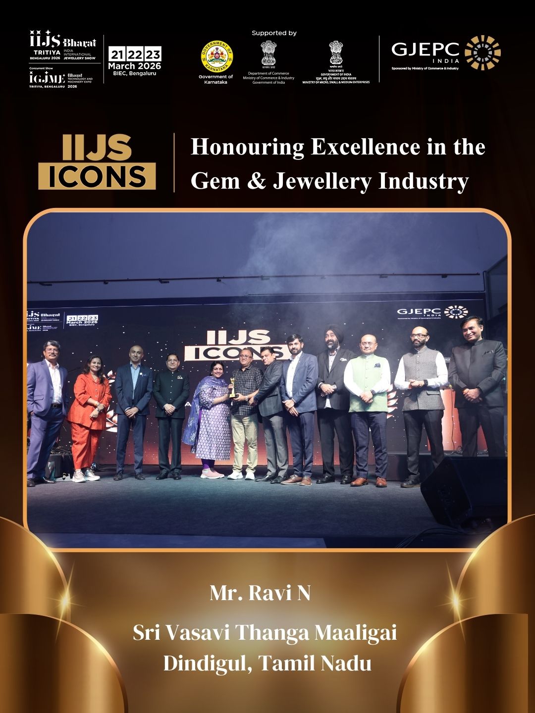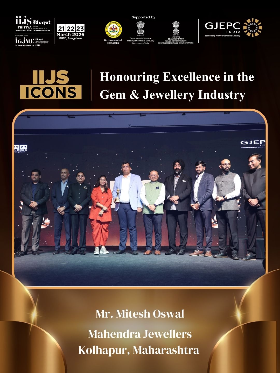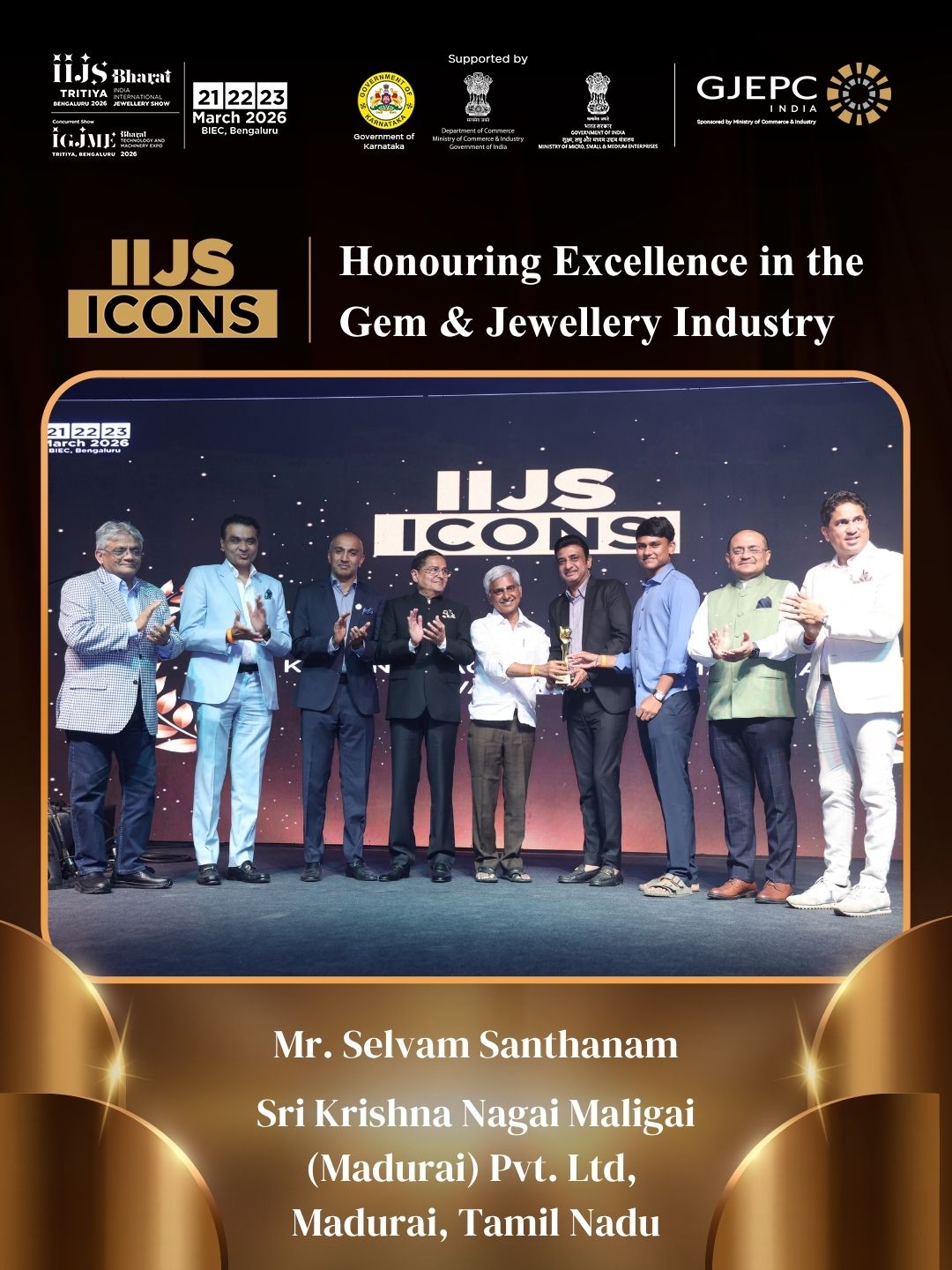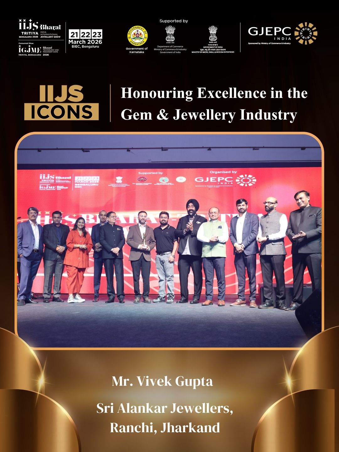 All the dignatories felicitating the IIJS Icon Mr. Shrikant Kari - President, The Karnataka State Jewellers Federation