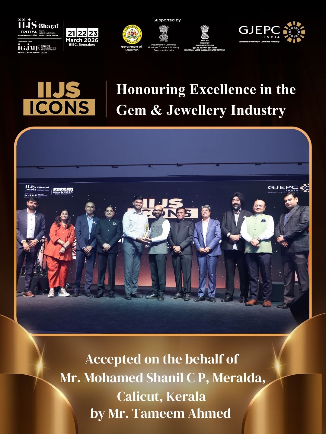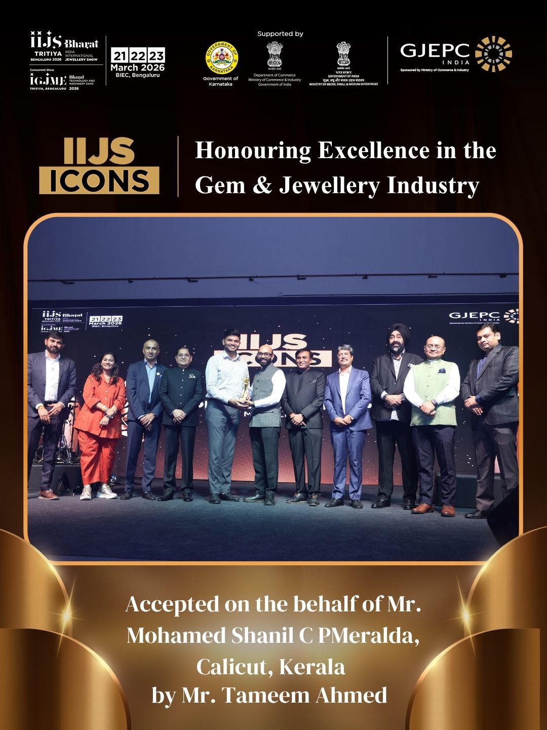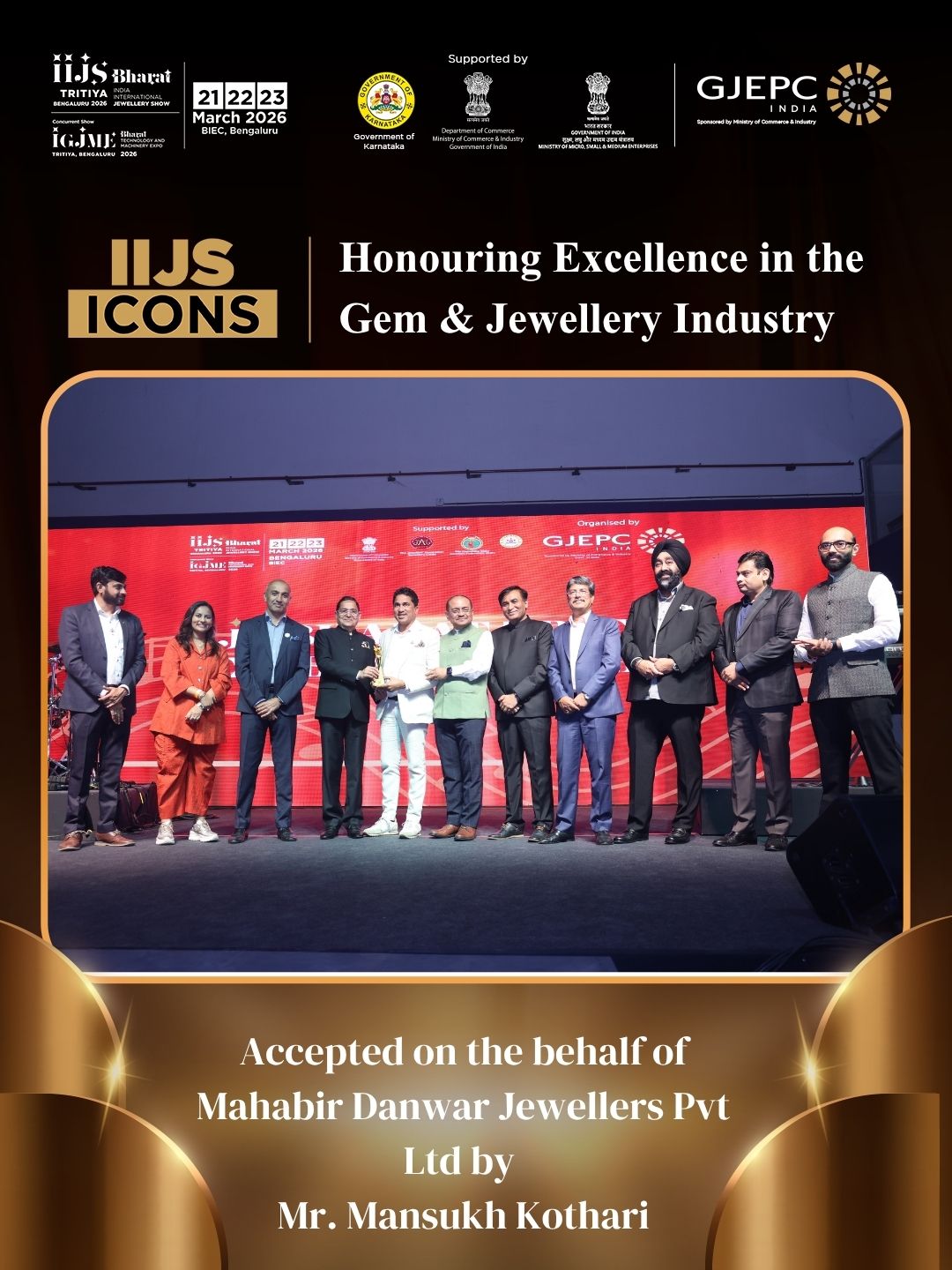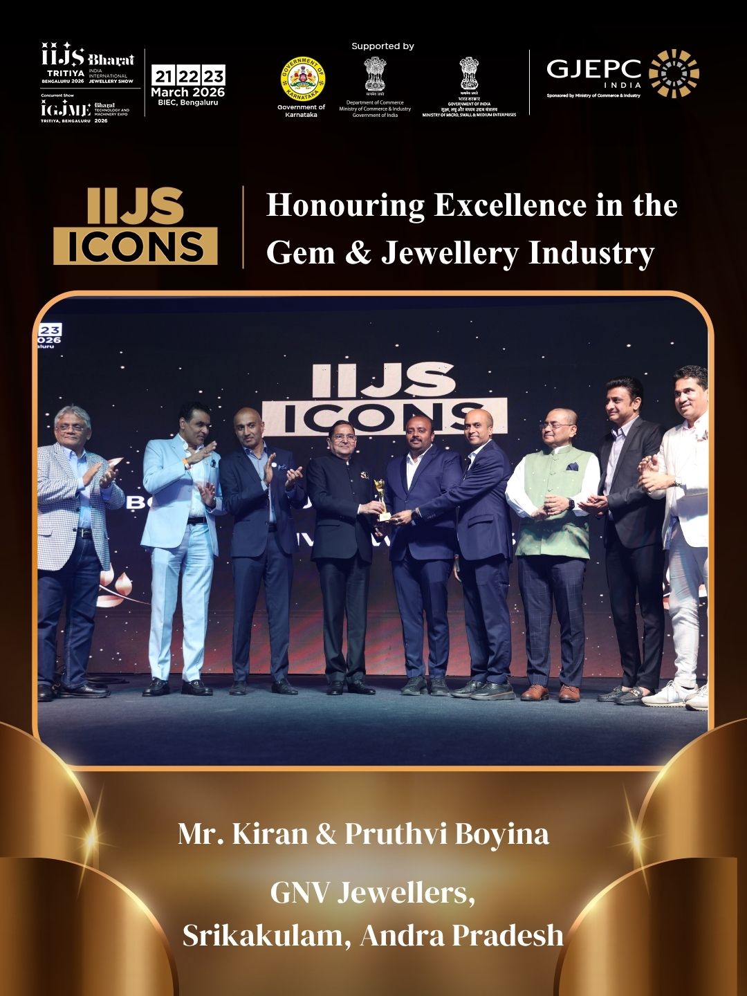 All the dignatories felicitating the IIJS Icon Mr. Shrikant Kari - President, The Karnataka State Jewellers Federation