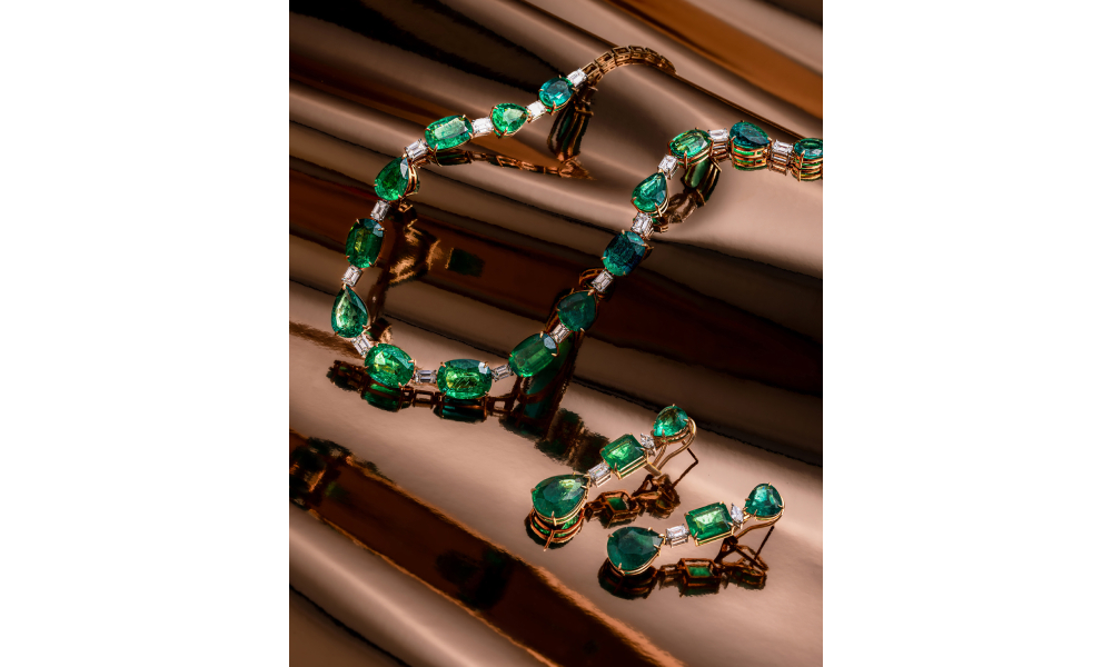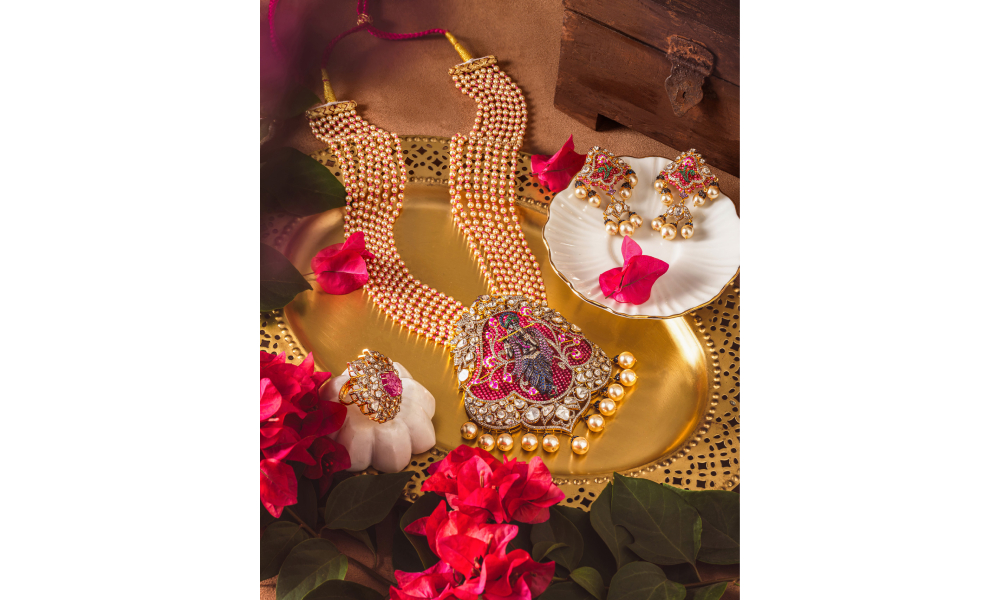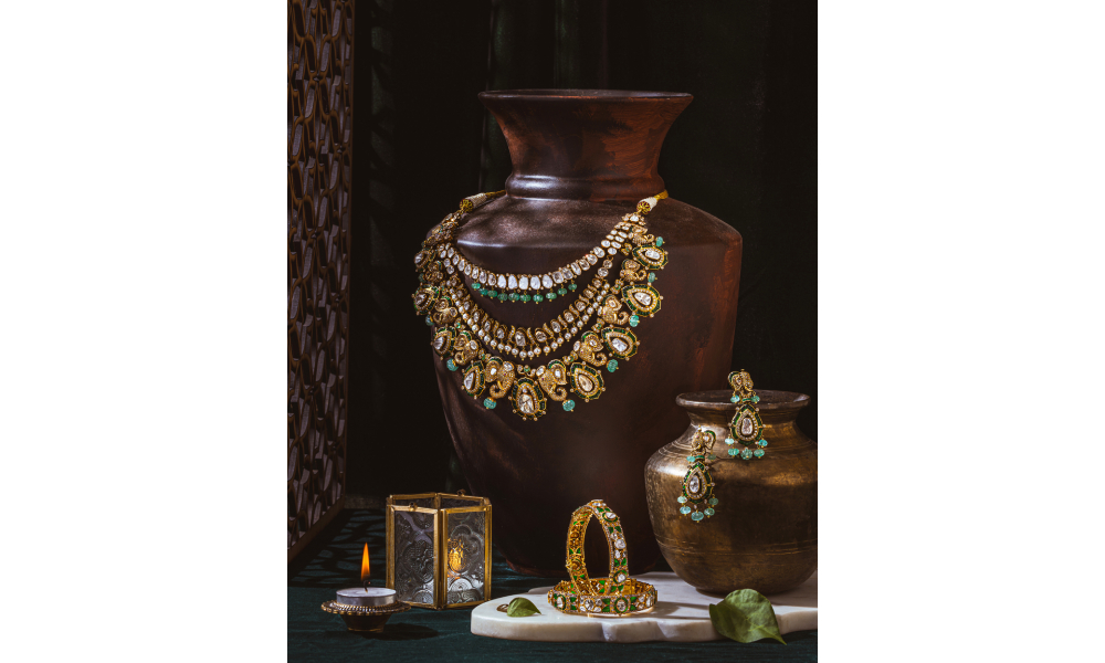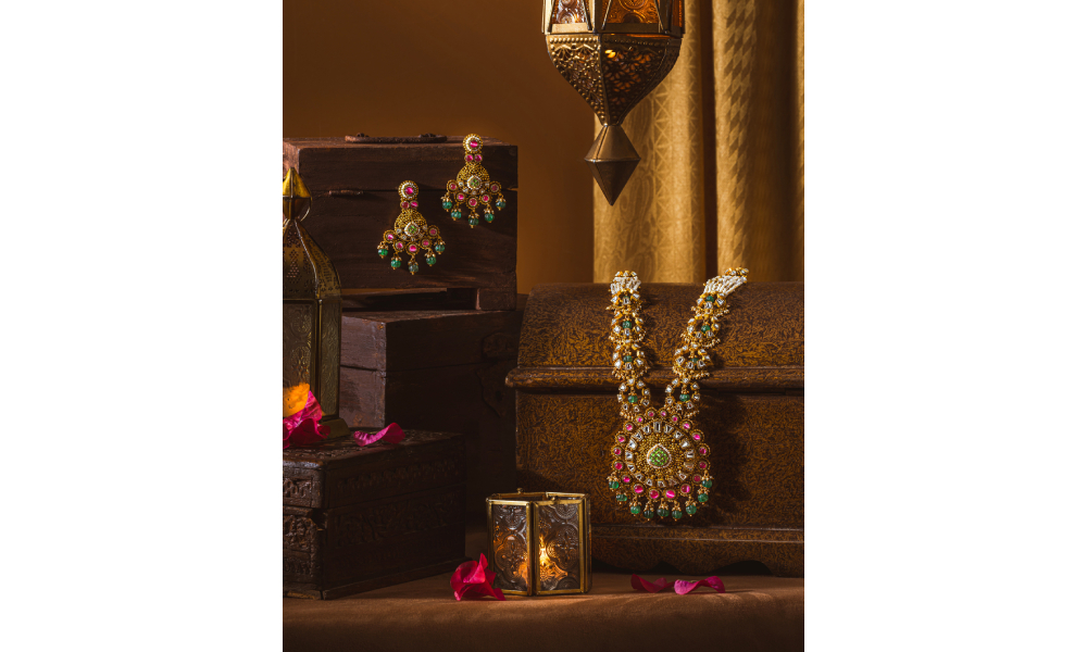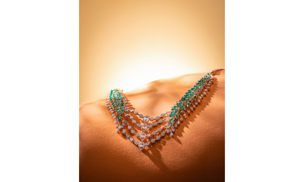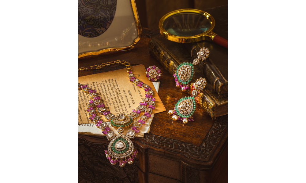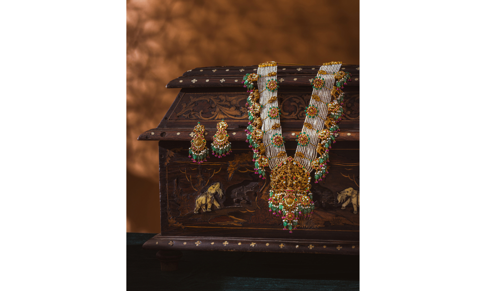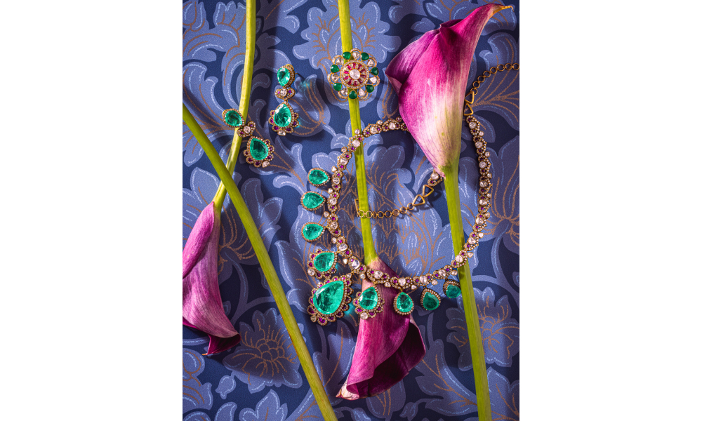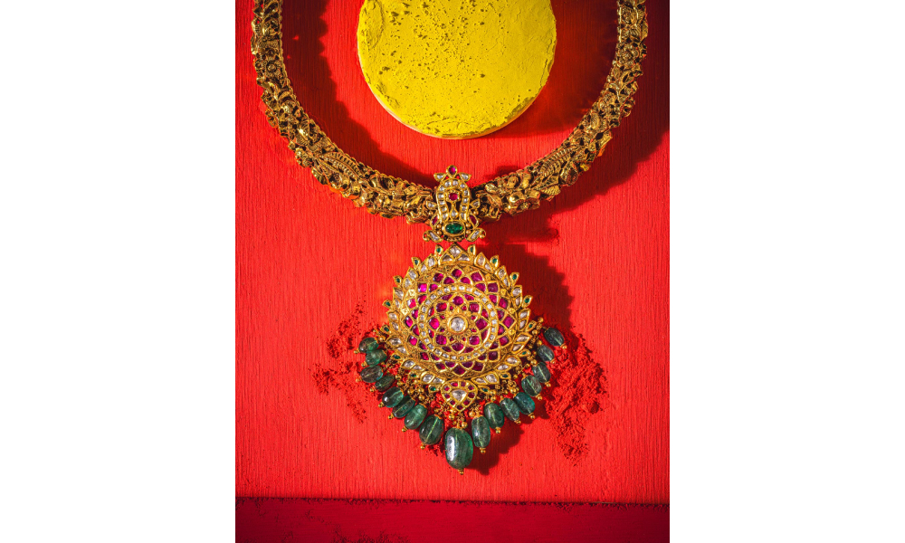 The grand multi-row necklace, featuring stylized elephants adorned with polkis and emerald accents, exudes captivating visual appeal. Paired with matching statement earrings and bangles, each piece showcases intricate detailing, making it perfect for bridal celebrations. By ACHAL JEWELS, JaipurThe bold necklace set adorned with vibrant contrasting colours, is set with gorgeous rubies, radiating polkis, and lush green emeralds. This ensemble stands out for its dynamic use of colour, making it an ideal pick for the Sangeet ceremony. By AGARWAL & CO., JaipurThe stunning, single-row necklace set is embellished with richly hued emeralds interjected with precisely cut diamonds, all set in a clean, structured silhouette. It’s the perfect choice for a minimalist bride looking to make a maximum impact. By GHANSHYAM DAS KOTAWALA, New DelhiThe ornate bib necklace set bears symmetrical motifs adorned with polkis and emerald beads. The set stands out for its elaborate design and bold presence, which are ideal for grand festive or bridal occasions. By GEETA SHYAM JEWELLERS, JaipurThe multi-strand pearl necklace suspends an elaborate pendant depicting Lord Krishna, suffused with rubies and framed with polkis. The collection’s bold colours and detailed craftsmanship reflect a rich cultural narrative. By JEWELS OF RAJPUTAANA, JaipurThe antique necklace terminating into a statement pendant accented with emeralds and rubies, features rawa and filigree work. The set blends tradition with festive flair, ensuring an unforgettable statement for special occasions. By KANCHAN ANTIQUE GOLD JEWELLERY, MumbaiThe two-row gold necklace, patterned with deep pink ruby drops and diamonds, is complemented by pendant earrings of the same design. The careful arrangement of gemstones and intricate detailing lends a feminine, lively touch to the set. By RAJ JEWELLERS, JaipurThe intricately carved nature-inspired gold hasli suspends a striking pendant with design cues drawn from mandala motifs. The pendant is adorned with rubies and fringed with graduating emerald beads. By SK SETH JEWELLERS, MumbaiThe single line gold necklace is composed of stylized heart-shaped motifs adorned with rubies and polkis, each suspending a pear-shaped emerald. The necklace is paired with double-drop earrings and a floral ring. By RJ JEWELLERS, JaipurThe multi-row pearl necklace is accented with intricately designed gold motifs embellished with emeralds and rubies. The standout pendant bears a beautifully carved idol flanked by elephant motifs, adding a symbolic touch of heritage and grandeur. By SHANTI S. SETH JEWELLERS, MumbaiThe elegant diamond-encrusted necklace composed of radiant geometric spokes is lined with floral motifs. Its structured layout contrasts with the burst of circular motifs, adding depth to the piece. By THE LEO JEWELS, MumbaiThe openwork necklace features layers of emeralds and diamonds, while the teardrop motifs and cascading leafy layers add a sense of movement and depth. By UMA ORNAMENTS, MumbaiThis unique necklace set dazzles with an array of diamonds and rose cut diamonds accented by pastel-hued emeralds, creating a refined yet captivating aesthetic. The blend of these soft-toned gemstones offers a refreshing balance of classic and contemporary appeal. By VALENTINE JADAU, JaipurThe new-age white gold necklace shimmers with the radiance of white diamonds, while the yellow sapphires add warm tones to the piece. The neck piece is paired with hoops featuring a similar combination of gemstones. By VIJAY GEMS & JEWELLERY, Bengaluru