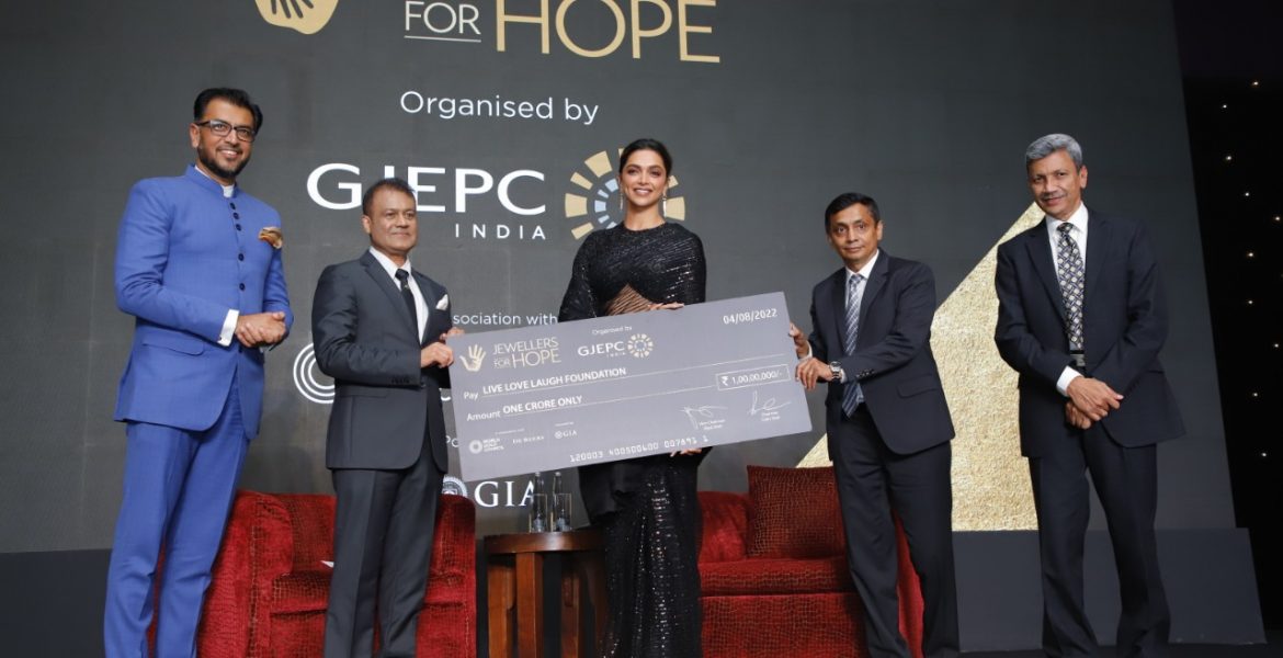 The Gem & Jewellery Export Promotion Council (GJEPC) organised the 7th edition of its charity dinner ‘Jewellers for Hope’ in association with World Gold Council and De Beers, and Powered by GIA. As every year, this year too, the event raised Rs. 1 Crore from Jewellers. The proceeds of the charity dinner were donated to leading Bollywood actress Deepika Padukone’s foundation Live Love Laugh (LLL) thatstrives to raise awareness about mental health issues and assists those in need. Deepika Padukone personally attended this event on behalf of LLL and spoke about the organisation and the impact it has created in India. This charity dinner was hosted on 4th August at Grand Hyatt, Mumbai.