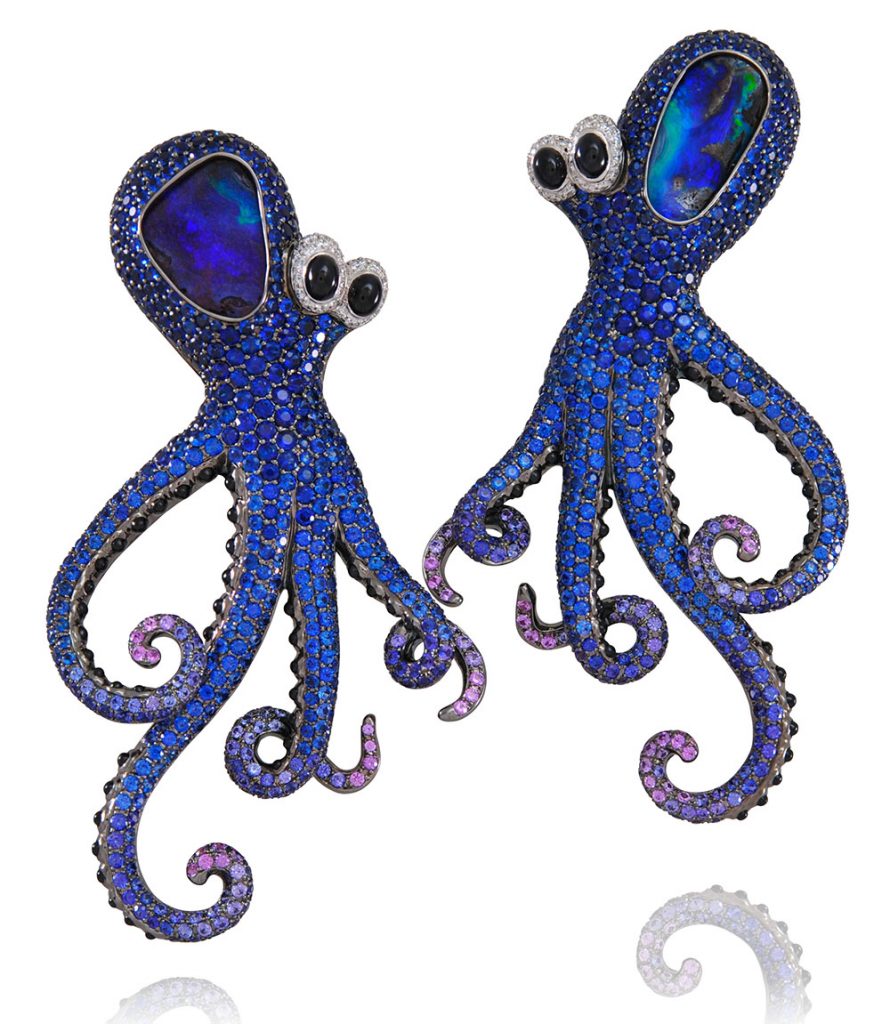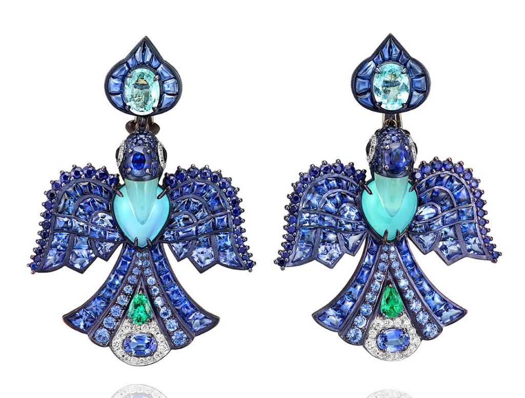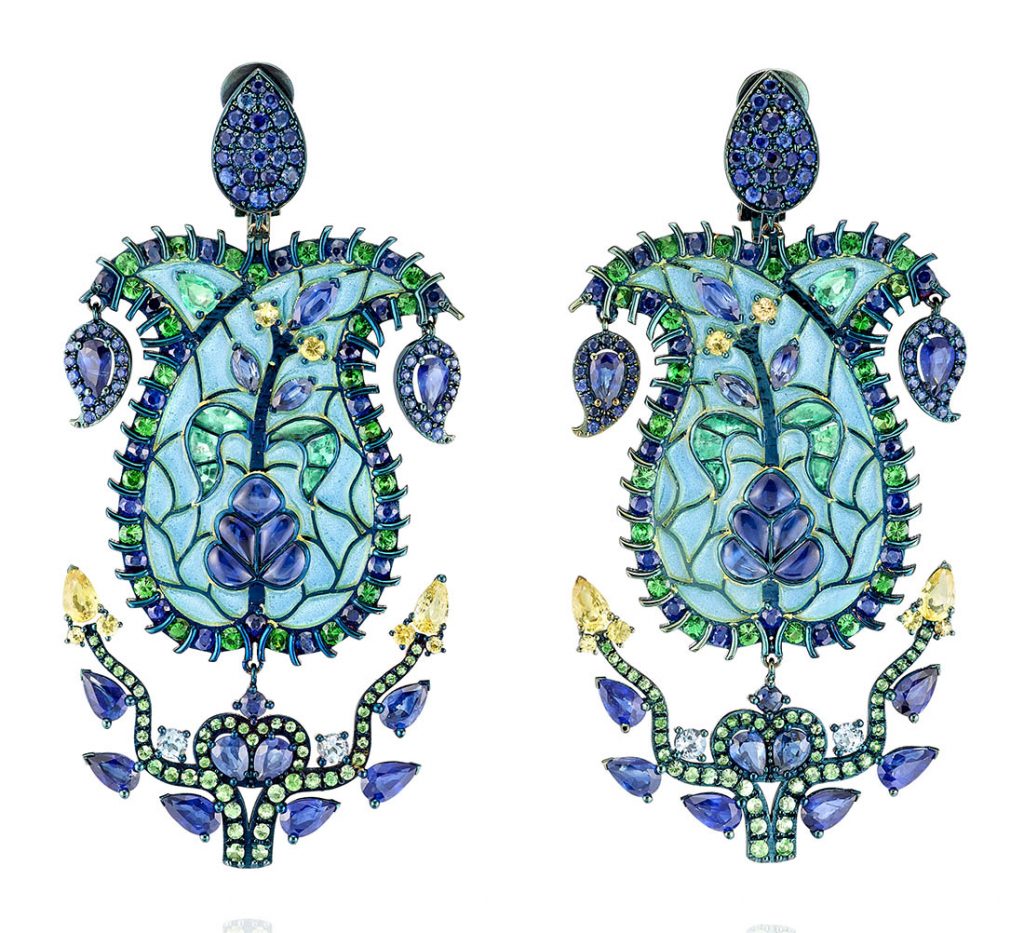 The unique black rhodium-plated gold earrings are dressed up with cabochon sapphires, Paraibas, emeralds, sapphires, tanzanites, and white diamonds.