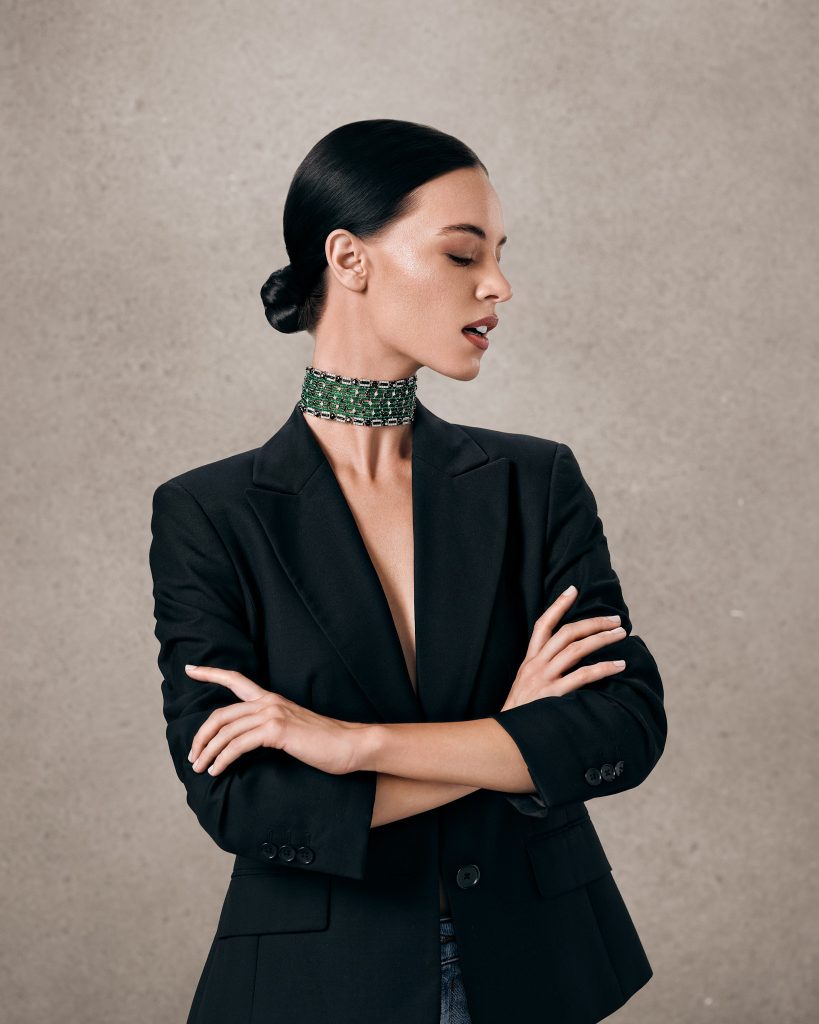 We took about six months to handpick 300 carats of Zambian emeralds. Each and every gemstone almost matches in colour and quality. The four-row Maharani necklace is fluid and feminine and is juxtaposed with emeralds and 18-karat gold hexagon motifs, studded with brilliant-cut diamonds.