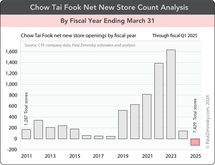 Chow Sang Sang’s large competitor, Chow Tai Fook, which has been opening new stores at a feverish pace over the last decade is on pace to net close stores this year. This serves as a proxy of sorts for the salient shift in overall jewellery demand in China (see figure above).