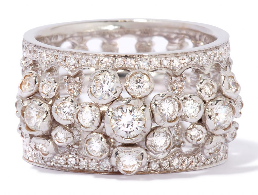 The beauty is they are ever evolving! Crown was one of my very first collections and remains a best seller. We offer it plain and with diamonds in 18-karat yellow, white and rose gold, and they interlace beautifully and were my first version of stacking rings. Marguerite was launched last Spring and was my very first 18-karat white gold and white diamond collection, which inspired me to design Love and Commitment to sit alongside.