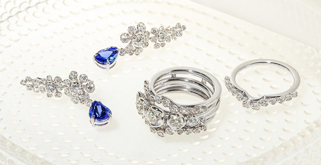 Annoushka Ducas’ new Love and Commitment is made from recycled gold and set with conflict-free, GIA-certified diamonds. The bridal line reflects on the evolution of long-term commitment. “The rings combine and stack, they build and evolve, just like a good marriage,” says the founder and creative director of Annoushka fine jewellery. The British jeweller’s offerings include earrings and rings set in a distinctly informal style, with diamonds and coloured stones such as rubellite, tanzanite and morganite.