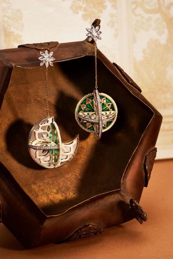 Aaina: Taking design cues from the famed Sheesh Mahal, the palace chamber celebrated for its intricate mirror work, the slender drop earrings are composed of three-dimensional panels set at different angles, each highlighting a different craft – mother-of-pearl with mirror inlay, vibrant meenakari in the central panel, and polki detailing in the third. The mirrors are positioned to reflect adjoining surfaces, recreating the endless shimmer and spatial illusion evoking the palace’s luminous interiors.