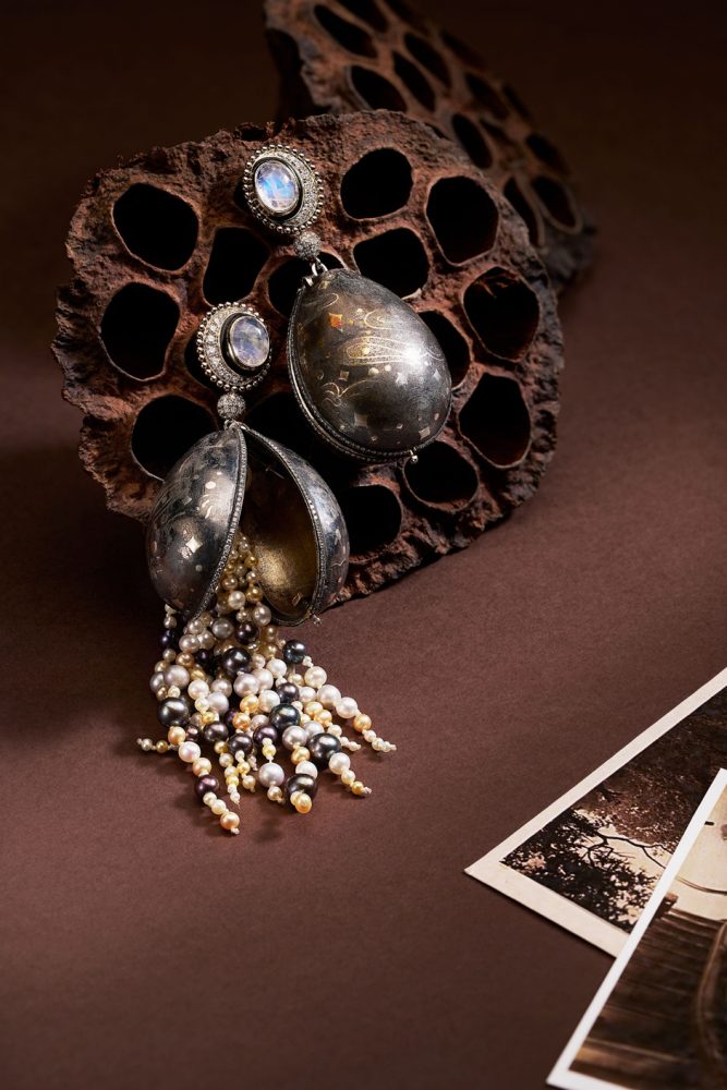 Aether: The white gold Aether earrings emerge from an inherited love for storytelling, conceived as a microcosmic jewel. Inspired by a myth in which the moon sheds luminous dewdrops into the ocean, this celestial gift is entrusted to oysters that shelter and transpose them into pearls. Crafted in Bidri work, characterised by darkened metal with intricate silver inlay, and enhanced with enamel and blue moonstone ear posts, the drop-shaped earrings evoke a night sky dotted with twinkling diamond stars. Mimicking nature, the earrings are transformative: when worn closed, they resemble a sculptural pod; when pressed gently, a concealed spring mechanism opens to reveal a cascade of pearls that fall like dewdrops from the moon.
