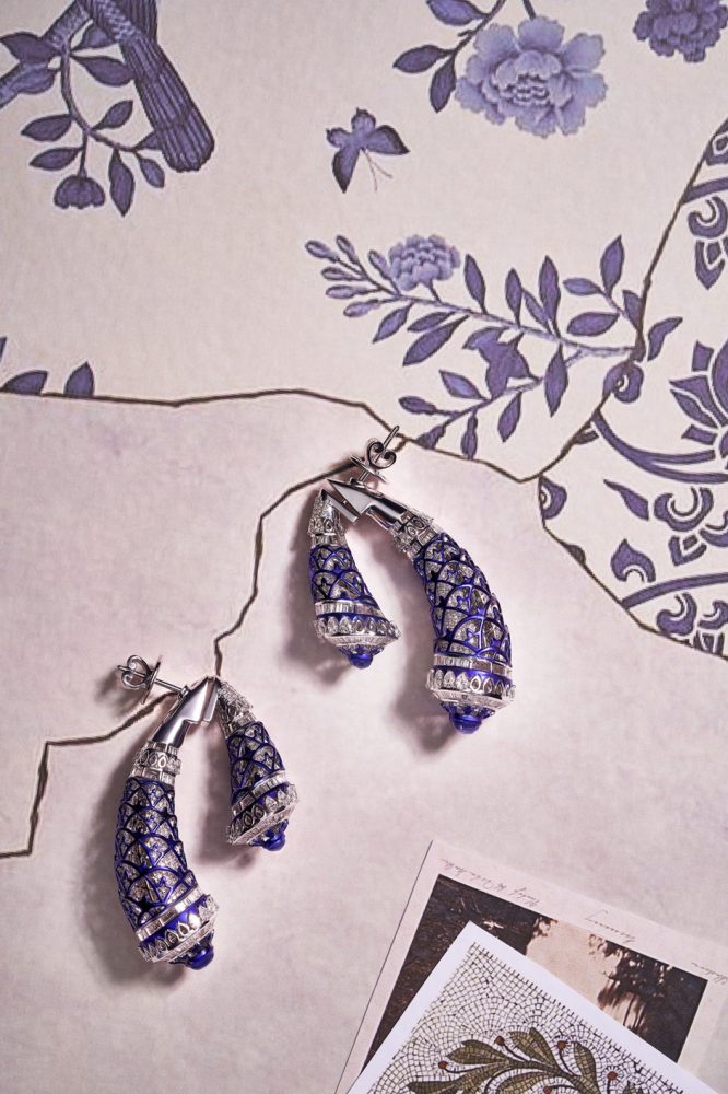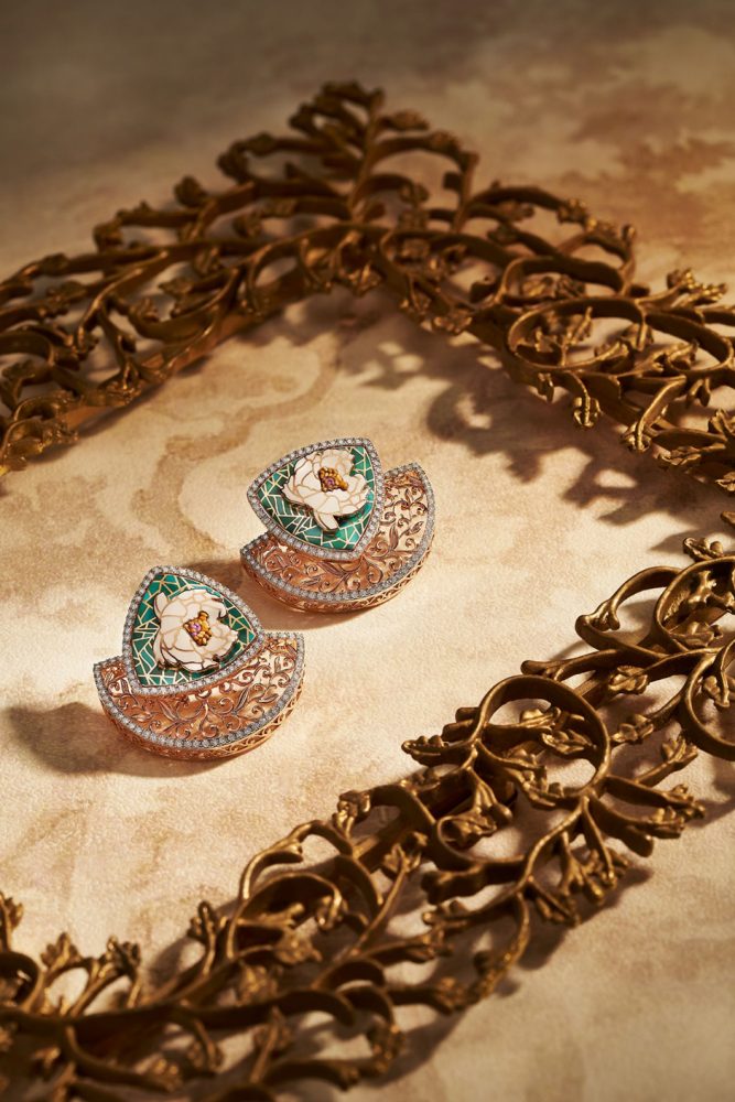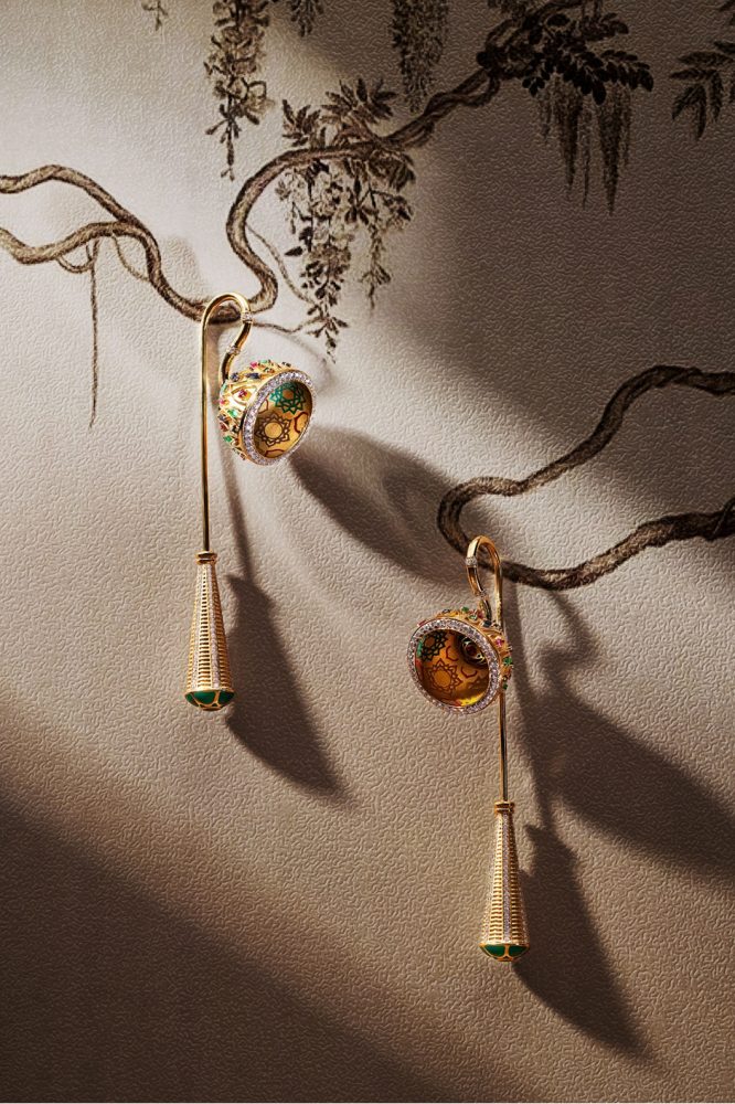 Micro engraving, plique-à-jour, green enamelling, along with pear- and round-shaped rubies, emeralds, blue sapphires, and brilliant-cut diamonds, enrich the piece—elevating it into a vibrant expression of healing, continuity, and tradition.