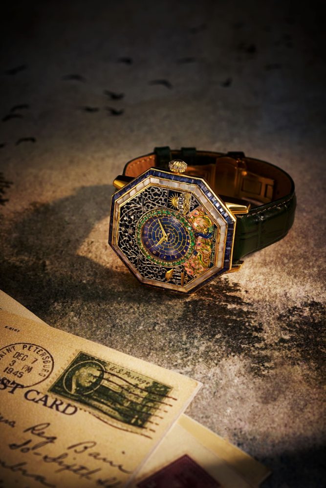 Secret Watcher: Celebrating mosaic artistry, the watch’s face is composed of intricate mosaic patterns, enriched with mother-of-pearl, hand engraving, meenakari, and jali work. The dial evokes an inky blue night sky, centred on a constellation rendered in micro mosaic.