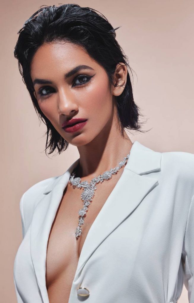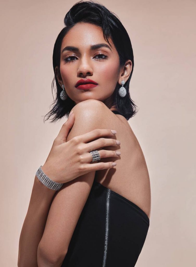 The Cascade Danglers employ rose cuts in claw-prong setting, along with flexible but thin knife-edge connectors to accentuate the beauty of these earrings. The curvaceous posts are embellished with brilliant-cut diamonds. The striking Raindrop bracelet is composed of round brilliant-cut diamonds in bezel-setting and pear-cut claw-set diamonds. Jewellery: HARAKH; Bralette: BALAV; Pants: SHIVANI MEHTA