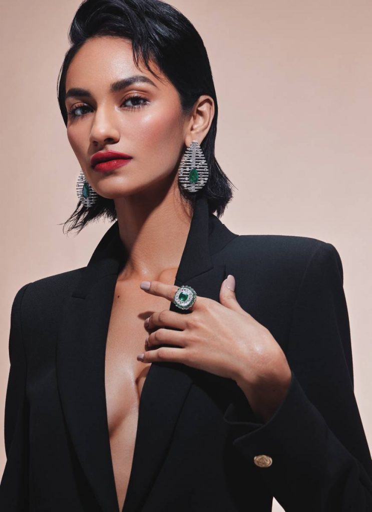The white gold large tear-drop earrings show off an arresting crisscross pattern in brilliant-cut diamonds garnished with rose cuts and intricately encased keshi pearls. In the centre is the hero of the piece – a pear-shaped emerald. The scalloped cocktail ring shaped like a stylised bloom is fringed with emeralds and rose cut petals surrounding a large deep green emerald framed with round diamonds. Jewellery: SAVAAB; Blazer: ZARA