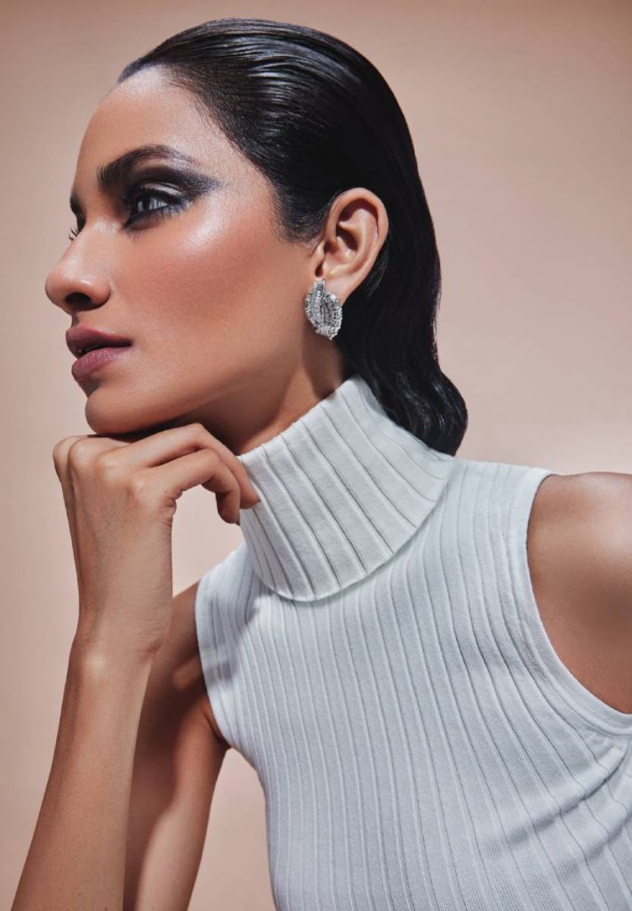 The ravishing elliptical ear studs crafted in white gold are fashioned with baguette and round brilliant-cut diamonds set in intersecting and wavy rows. Jewellery: MOKSH FINE UNSEEN JEWELS (TANVIRKUMAR & CO.); Sleeveless Turtleneck: ZARA