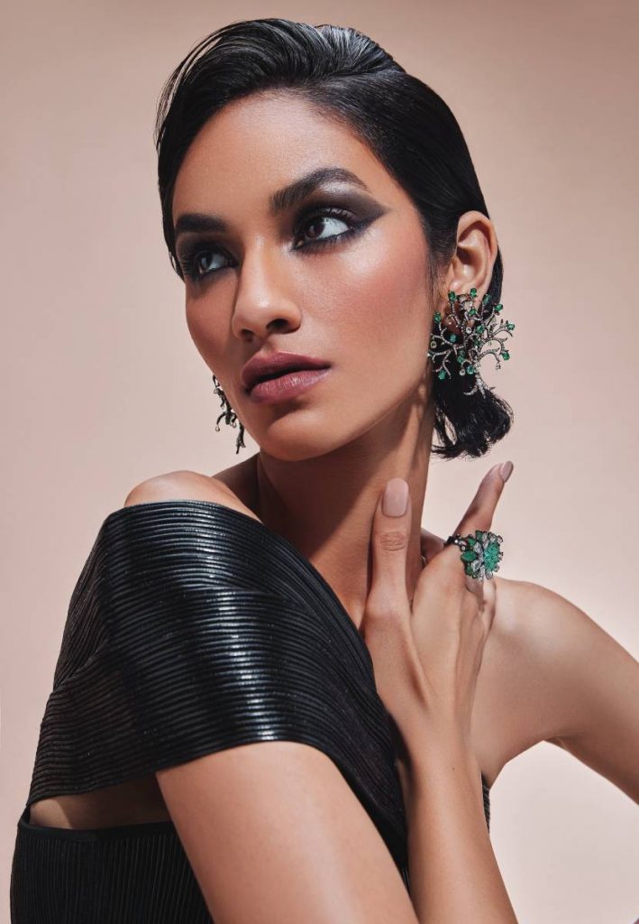 The super contemporary one-off Summer Tree of Life earrings replicate the cyclical phases of nature. The earrings are ‘painted’ in shades of brown gold, and employ rose cuts, reverse-set brilliant-cut and briolette diamonds, and oval faceted emeralds. The organic floral ring in 18-karat gold shaded with brown gold tones features carved emeralds and beads with a spread of pear-shaped diamond leaves. Jewellery: VAK JEWELS; Blouse: RIMZIM DADU