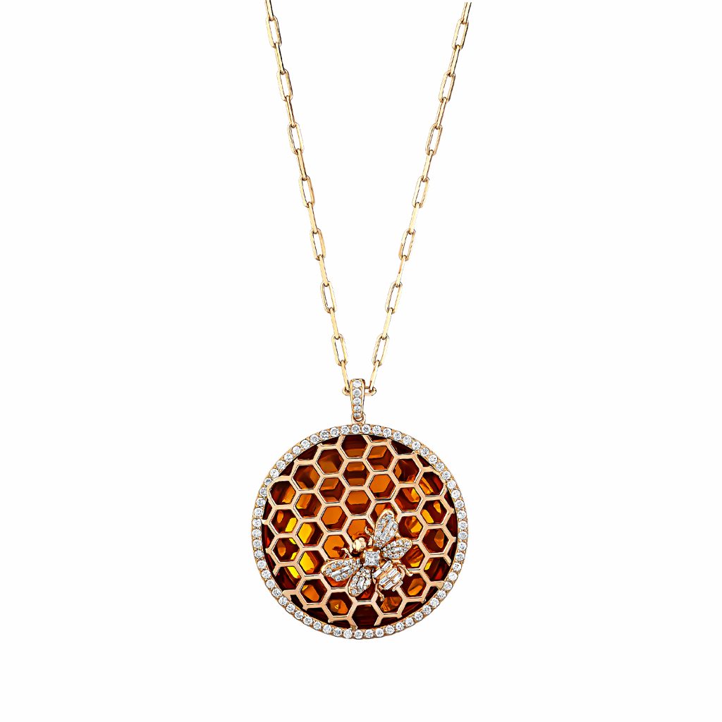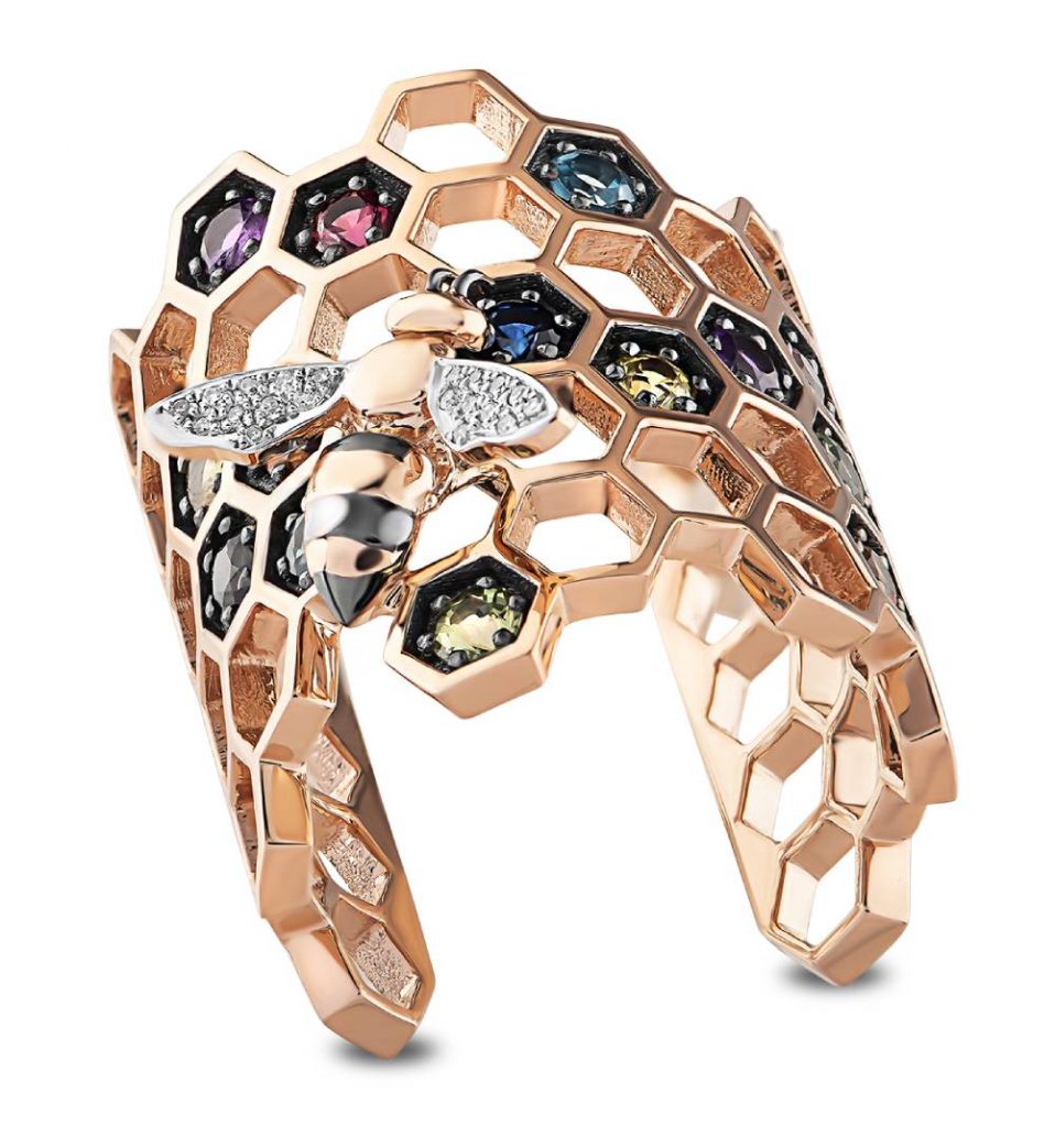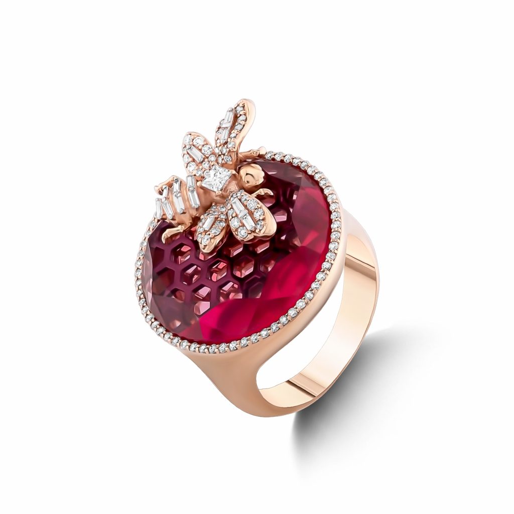 There are over 130 pieces in the Honey collection crafted 14- and 18-karat rose gold and precious gems. Our new Honeycomb cocktail rings feature tourmaline, amethyst, peridot, citrine, and orange sapphire. We have also used intricate layering techniques in craftmanship. Each gemstone represents different powers, and our queen bee connects us to that colour and power. The jewellery is carefully handcrafted by our master craftsmen in our atelier in Istanbul’s covered bazaar using 5000-year-old goldsmithing skills, which have been passed down from generation-to-generation.