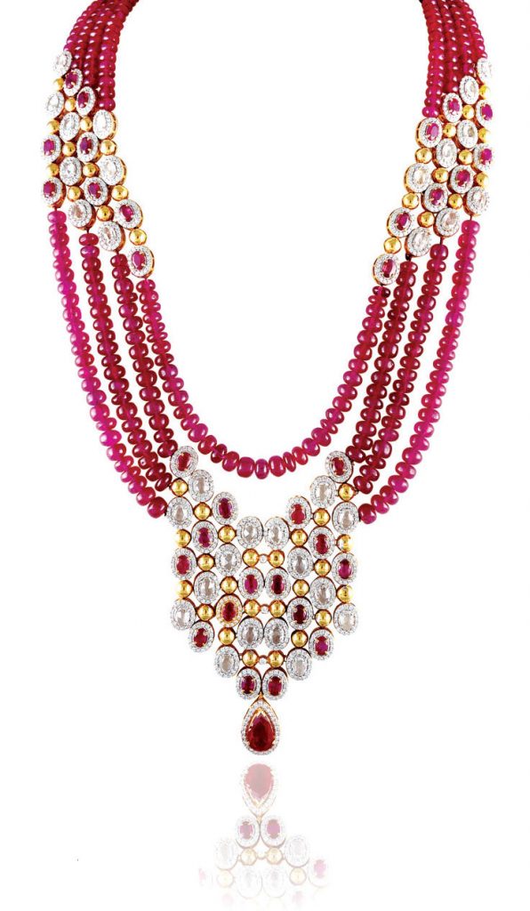 Multi-row gold necklace set with Gemfields Mozambican rubies featuring geometric clasps and a pendant set with diamonds and gold beads. By Narayan Jewellers by Ketan & Jatin Chokshi, Vadodara