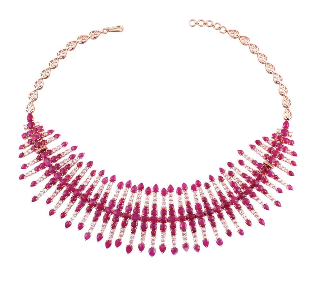 Gold floral necklace fashioned with Gemfields Mozambican rubies. By Gem Plaza, Jaipur