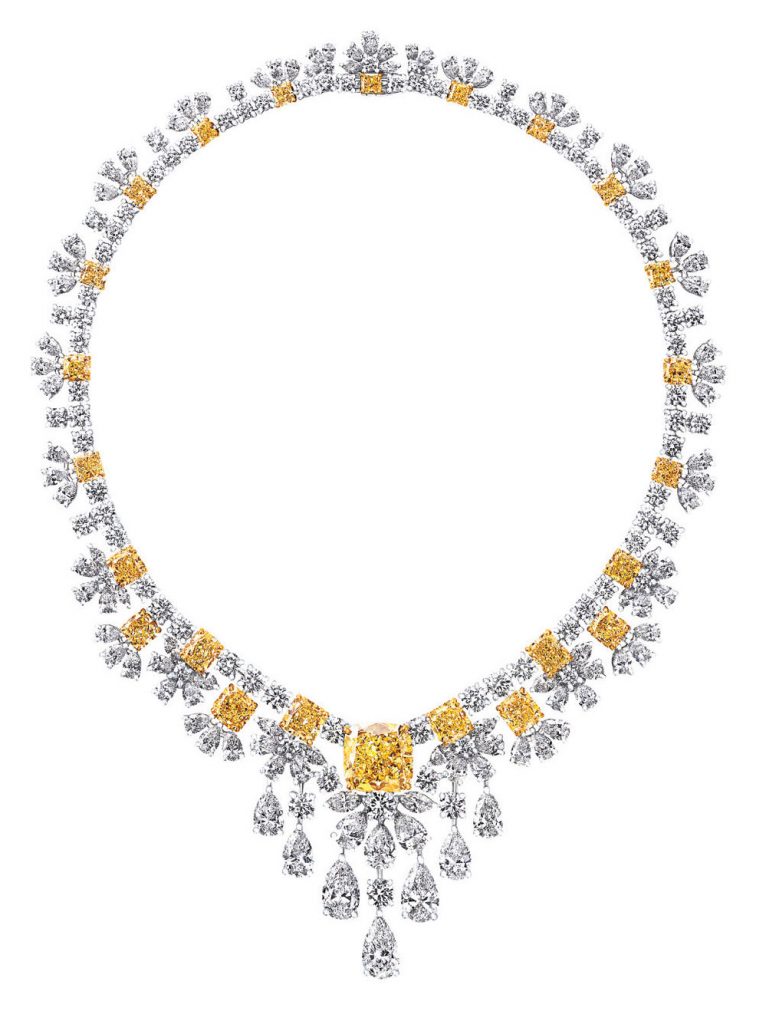 White gold necklace dressed with radiant-cut yellow diamonds, white round, pear-shaped diamonds. By Graff, UK