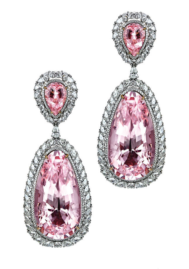 The 18-karat rose gold earrings are graced with 15 carats of diamonds and 76 carats of kunzite. By Sutra, USA