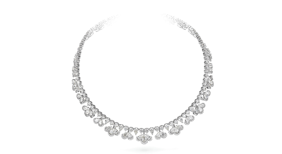 Necklace in 18-karat white ethical gold certified “Fairmined” set with pear- and brilliant-cut diamonds, sourced from a producer, who is an RJC certified member. By Chopard, Switzerland