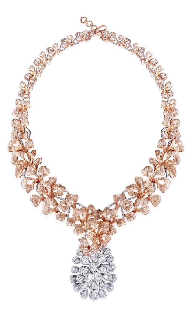 Nature-inspired two-tone white and rose gold floral necklace outfitted with diamonds. By Narayan Jewellers, by Ketan & Jatin Chokshi, Vadodara