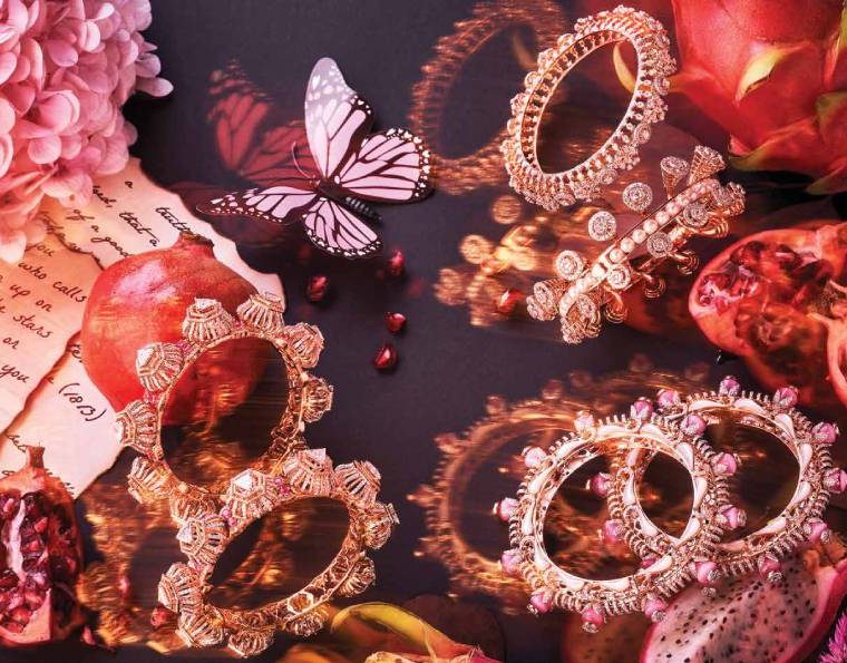 (Left) Openwork domes lined with round diamonds and topped with fancy-cut polkis grace these pacheli bangles garnished with rubies. By Prism Jewellery (Centre) Lined with pearls, the pacheli bangle features curvy spokes…