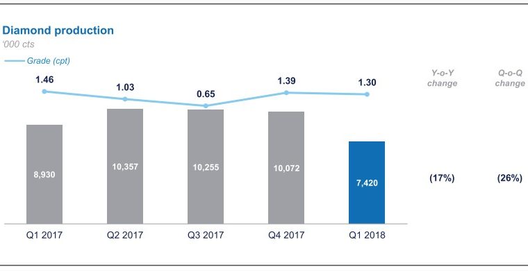 Alrosa, the world’s biggest diamond producer, reported a 17% decline in diamond production for the first quarter of 2018 to 7.4 million carats owing to production slowdowns caused by an accident last…