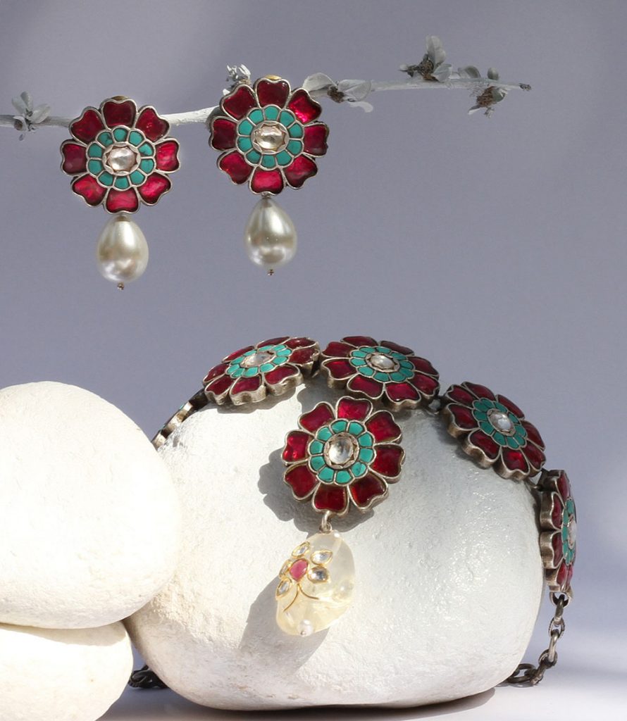 Sangeeta Boochra’s modish collections realised in silver and accented with polkis and gemstones have an underlying connect to antiquity. A designer and jewellery business entrepreneur, Sangeeta learned the ropes from her father-in-law Seth Lalit Kumar Boochra, who ran a jewellery manufacturing company. Inherently talented, Sangeeta is a self-taught designer and has learned the art of making fine jewellery at the workbench. Today, the handmade creations of her eponymous label are worn by clients including Bollywood & Hollywood stars, celebrities, and royalty.