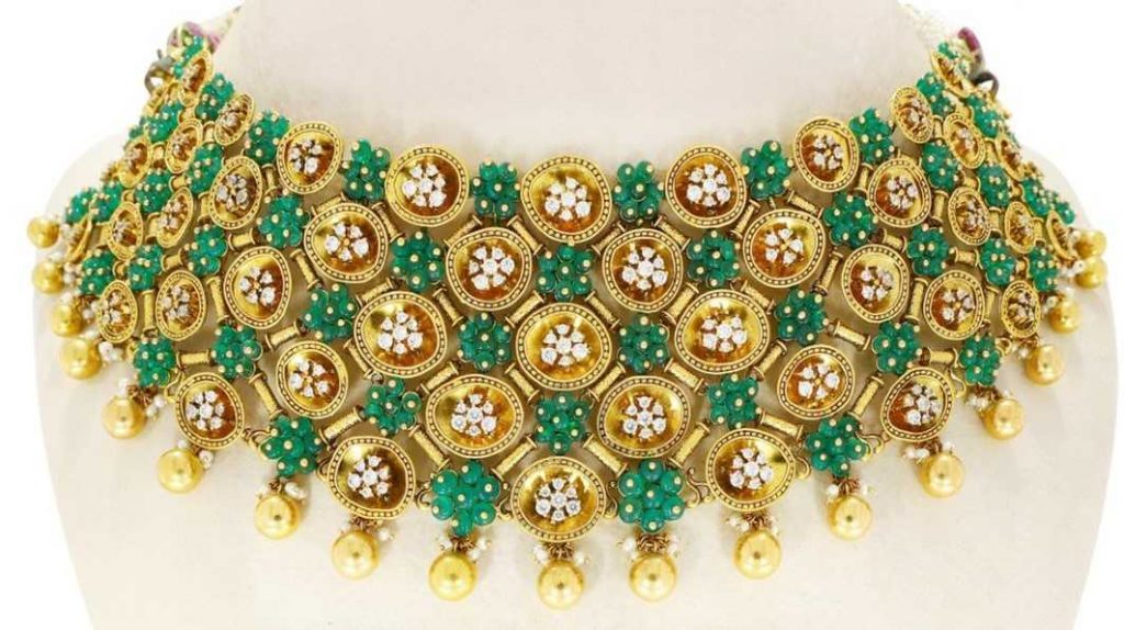 The symmetrical necklace juxtaposed with oval motifs of gold and diamond oval motifs and floral emerald beads recreates a stylish narrative for the modern-day bride. By CVM