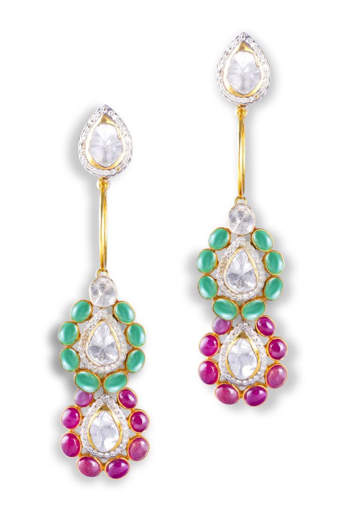 Double drop linear earrings studded with polkis, emeralds and rubies. By Rosentiques