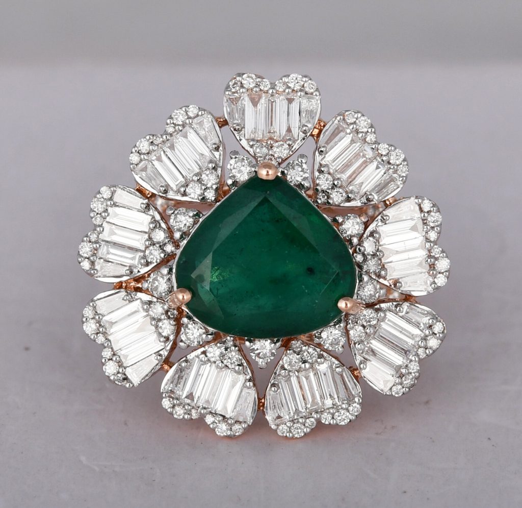 A fancy-cut emerald is the hero of this gold ring framed with diamond petals from the Emeralda collection. By Savio Jewellery