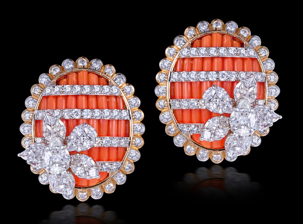Oval ear studs designed with corals and diamond florets. By Sanskriti