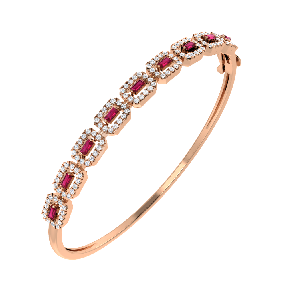 A slim and sleek gold bangle featuring baguette ruby motifs, each bordered with diamonds. By Tanvirkumar & Co