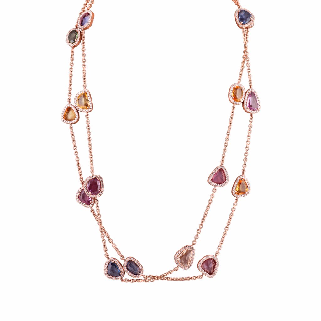 Double layered gold station necklace set with multicoloured sapphires. By Gem Plaza