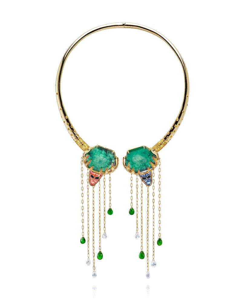Parisian artist Lydia Courteille took inspiration from Mexico’s folkloric Huichol art, which emphasizes the communion of symbolic narrative and mystic shamanism. The necklace “Pair Of Deer” pays tribute to Marra, the essential deer deity in Huichol culture who provides food, life, and knowledge. The 18-karat open gold necklace features two deer heads and is adorned with diamonds, yellow sapphires, onyx, 45.46 carats of emeralds, and tsavorite.