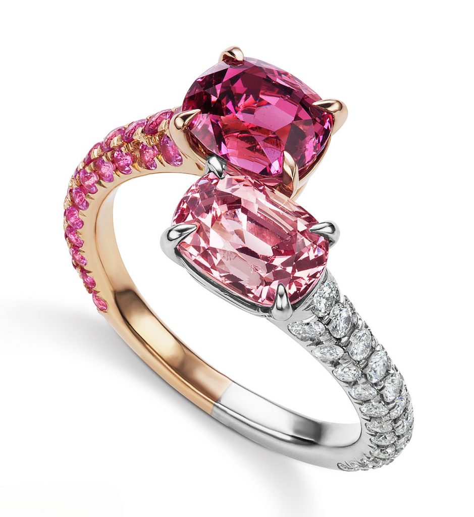 The Toi et Moi ring crafted with pink gold and platinum is set with diamond and pink sapphire melee. The finials feature unheated cushion pink and magenta spinel pair.