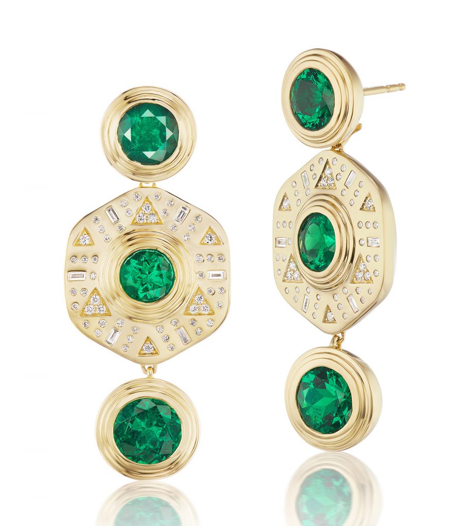 Loren Teetelli of Loren Nicole has dreamed up around half a dozen pieces for her capsule line. The designs look at the history of emeralds, centered on Latin American. “My specialty as a pre-Columbian archaeologist drove a lot of excitement to create pieces about the period’s history, most directly, the Mochica earrings, which reference a common shape seen across most pre-Columbian cultures,” says the Los-Angeles-based designer.