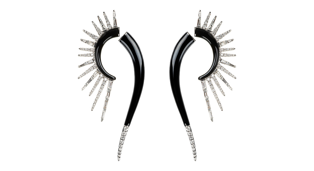 Using a mix of gem shapes and or sizes makes the design more interesting and bespoke, observes Kimberly McDonald. Her pieces reveal an “intentional placement to each one, rather than a continuous frame which is also beautiful but much more conventional.” Kimberly uses irregular and organic gems and slices to adorn her beautiful creations, as evidenced in this pair of earrings (featured in the article) set with boulder opals in the centre, framed with grey and white diamonds in varied sizes along with diamond slices and accented with handcarved sapphire rosettes.