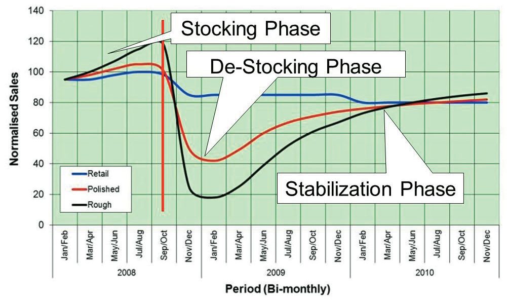 If we examine what the industry underwent, it is apparent that upstream areas like rough and manufacturing were affected more severely than others. Words used to describe this phenomenon include de-stocking/re-stocking, ripple effect and bull-whip effect. The pattern clearly suggested that the industry behaved exactly like any other. This phenomenon is the result of perfectly rational people making sound business decisions. But sometimes, even rational behaviour amplifies volatility up the pipeline.
