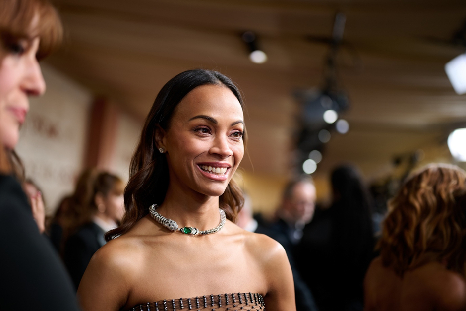 Proud Oscar winner Zoe Saldaña debuted Cartier’s Panthère Versatiles diamond-studded necklace, featuring a10-carat Zambian emerald at its centre, with twin panther heads. She paired the necklace with Cartier’s diamond studs.© A.M.P.A.S.