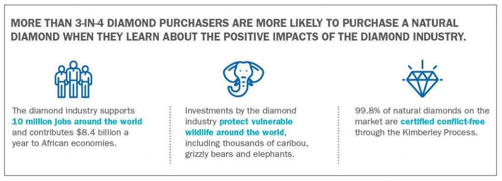The survey found that threequarters (78%) of Americans are more likely to consider purchasing a natural diamond once they learn of the positive social, economic and wildlife conservation impacts of the diamond industry. Key facts that influence purchasing decisions include: