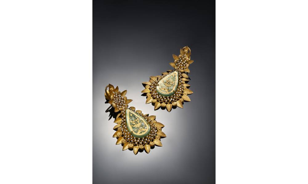 Redefining bridal gold with Thewa’s timeless art, these nature-inspired gold earrings artistically combine the central Thewa motifs framed in diamond-studded mesh and hand-textured leaves. By ANAND SHAH