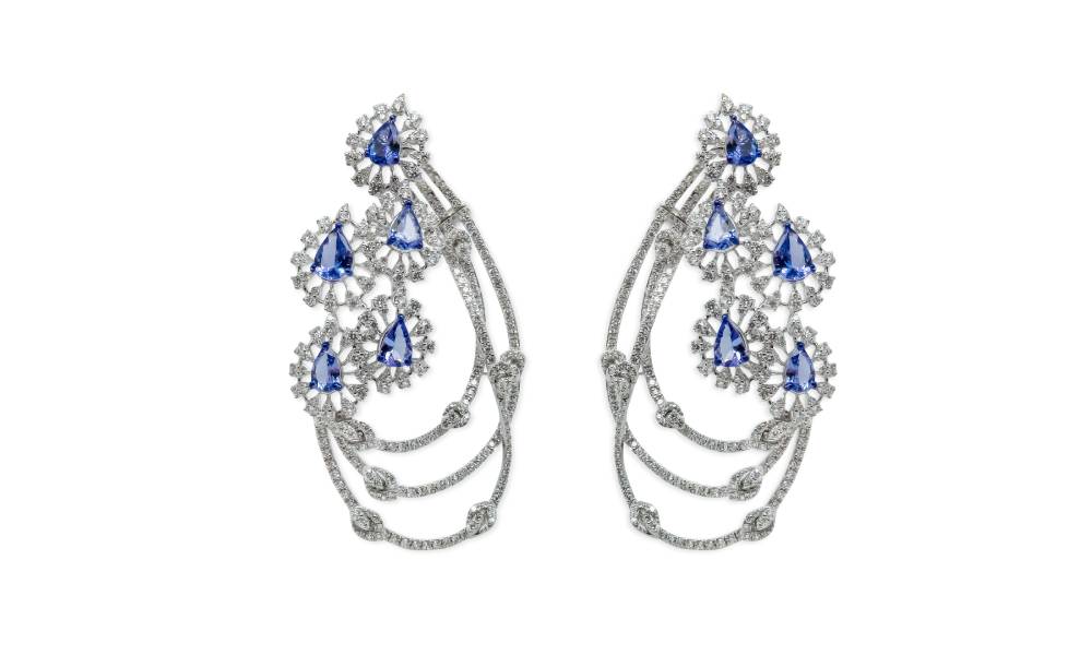 Loopy C-shaped white gold earrings, punctuated with diamond motifs, are topped with a cluster of delicate floral motifs, each dotted with a pear-cut tanzanite. By ANAND RANAWAT for DHANRUPJI DEVAJI CO.