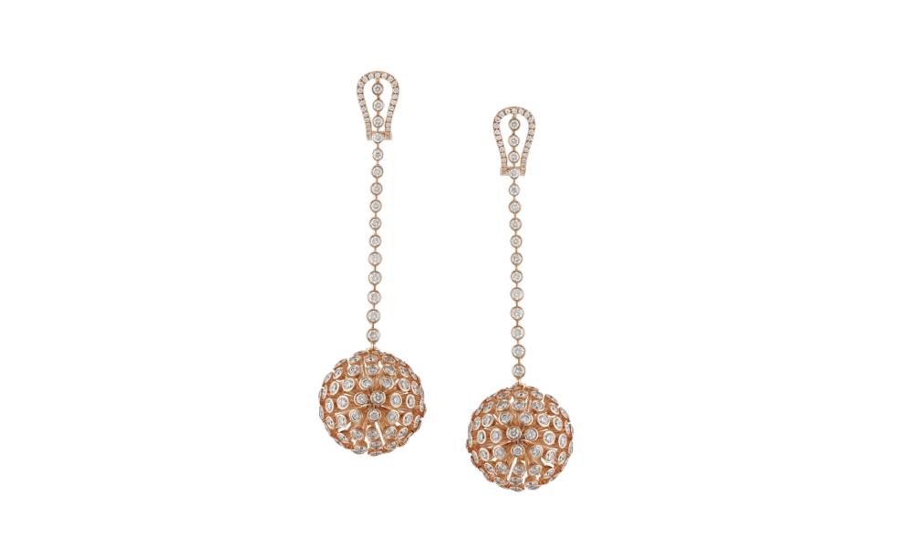 Trendy Disco Ball earrings in 18-karat gold feature diamond posts extending into a linear arrangement of bezel-set diamonds, suspending 3D spheres crafted from spokes and adorned with diamonds. By SAWANSUKHA JEWELLERS