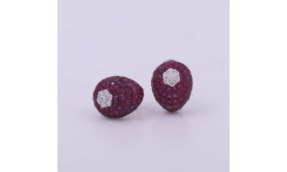 The oval ear studs are adorned with rows of invisibly set rubies, each highlighted with a bloom composed of seven diamonds. By MANOJ ORNAMENTS