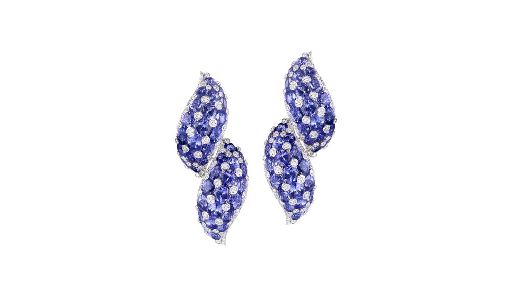 Shapely two-leaf earrings wrought in white gold are infused with tanzanites and dotted with bezel-set white diamonds. By MOHAR GEM AND JEWELS LLP