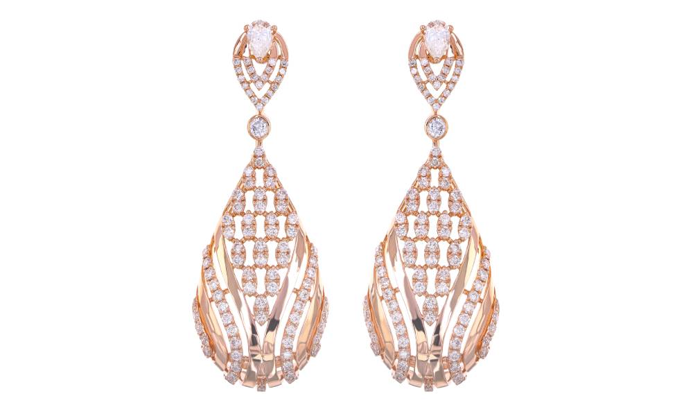 The statement gold earrings with inverted drops feature large diamonds suspending drop-shaped openwork earrings in a satin finish, showcasing a rhombus lattice design set with diamond-studded oval motifs. Rows of curvaceous diamonds enhance the allure of these stunning earrings. By GNS JEWELLERY