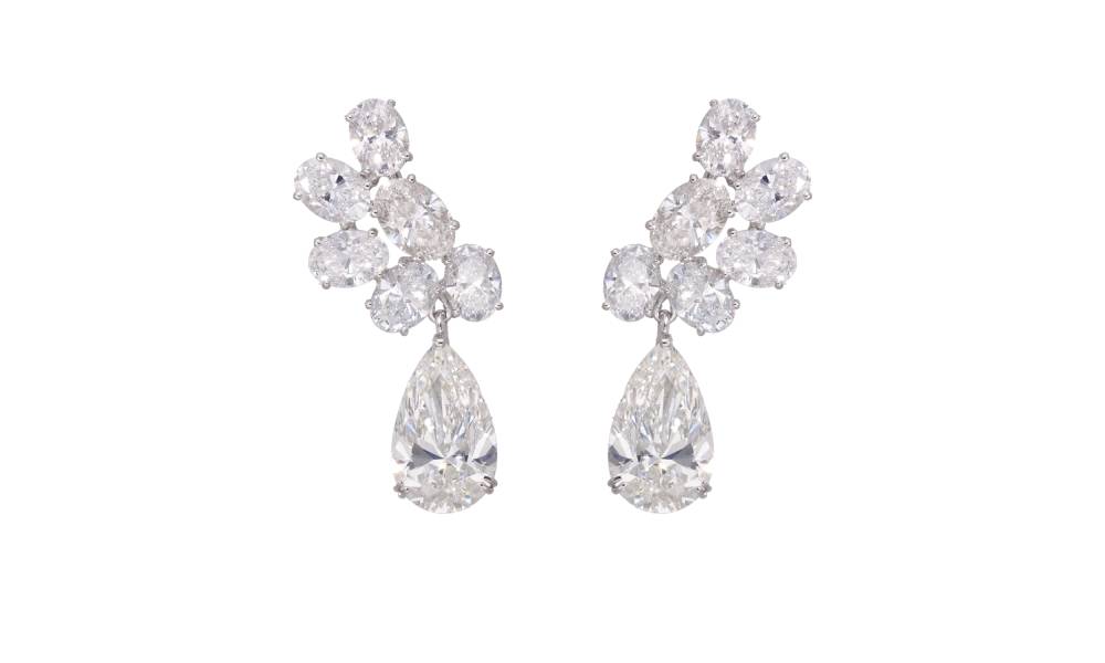 It’s diamonds all the way with these earrings. Icy cool and sophisticated, the earrings are designed with large diamond drops, and an assemblage of five oval diamonds on each earring. By GDK JEWELS